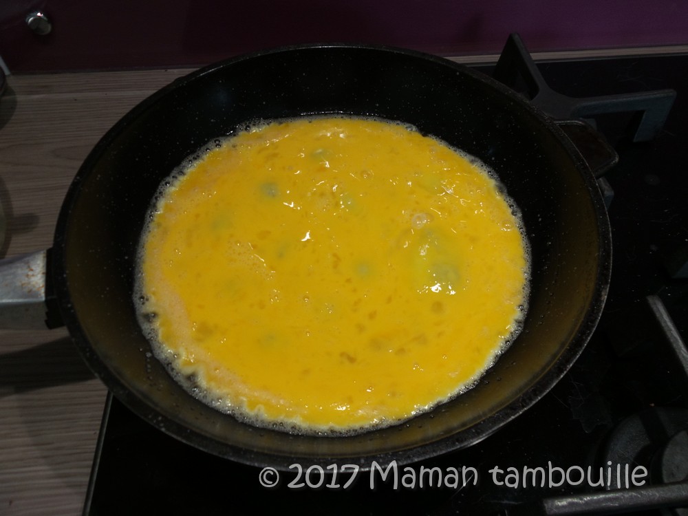 Verser les œufs d’un seul coup et couper le feu aussitôt.