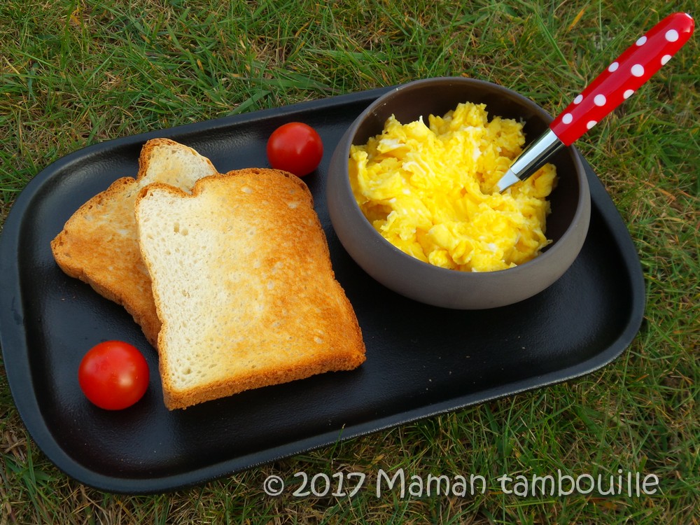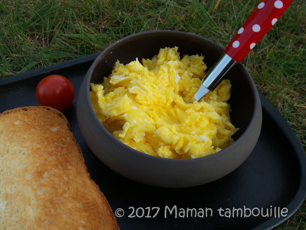 Bref, j’ai testé pour vous et nous nous sommes régalés. Les oeufs n’étaient pas secs comme cela peut arriver parfois si on les cuit trop, ils n’étaient pas non plus trop baveux comme je n’aime pas et enfin, ils n’étaient pas trop gras (on tout cas, ici, on n’ajoute pas 3 tonnes de beurre ou de crème pour les rendre onctueux). Facile, rapide et efficace, à servir avec du pain de mie grillé !