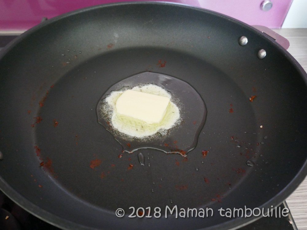 Dans une grande poêle, chauffer un morceau de beurre avec un peu d’huile.