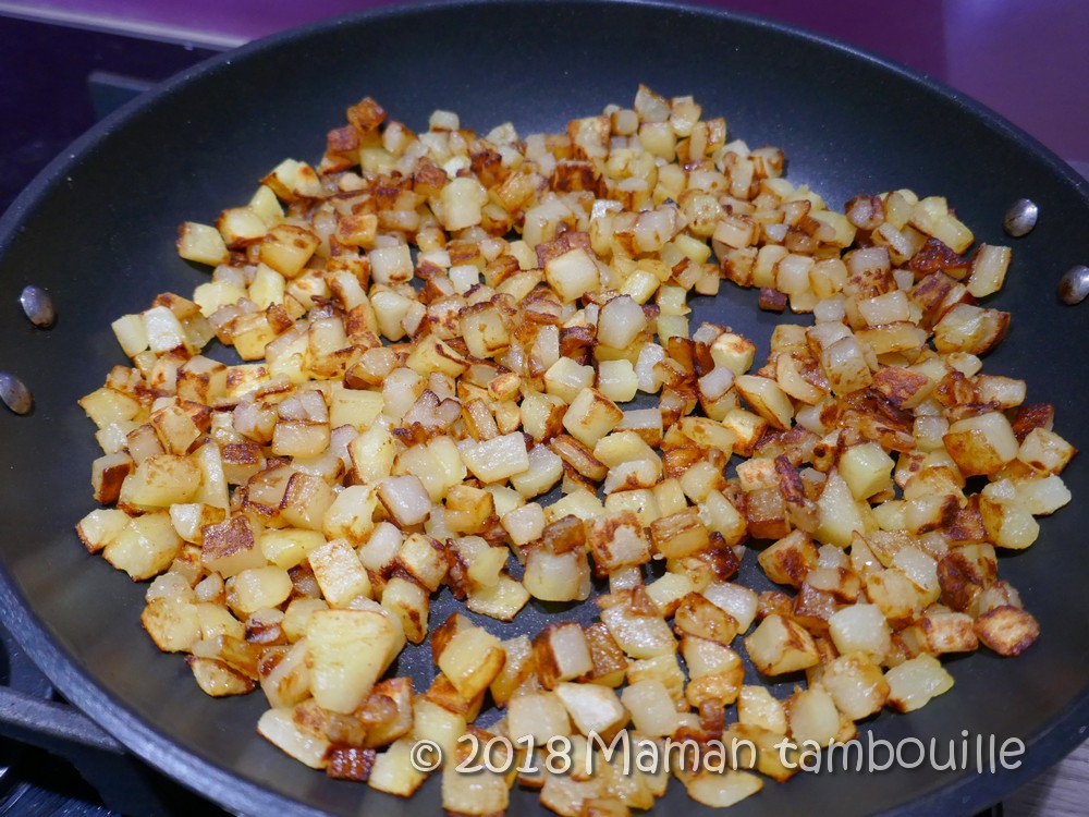 Eplucher les pommes de terre et les couper en petits cubes. Rincer les cubes et bien les sécher dans un torchon.