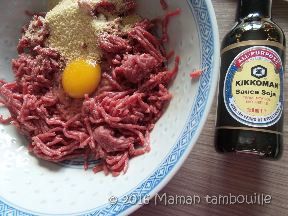 Dans un saladier, préparer la farce en mettant le boeuf, l’oeuf, la sauce soja, la chapelure.