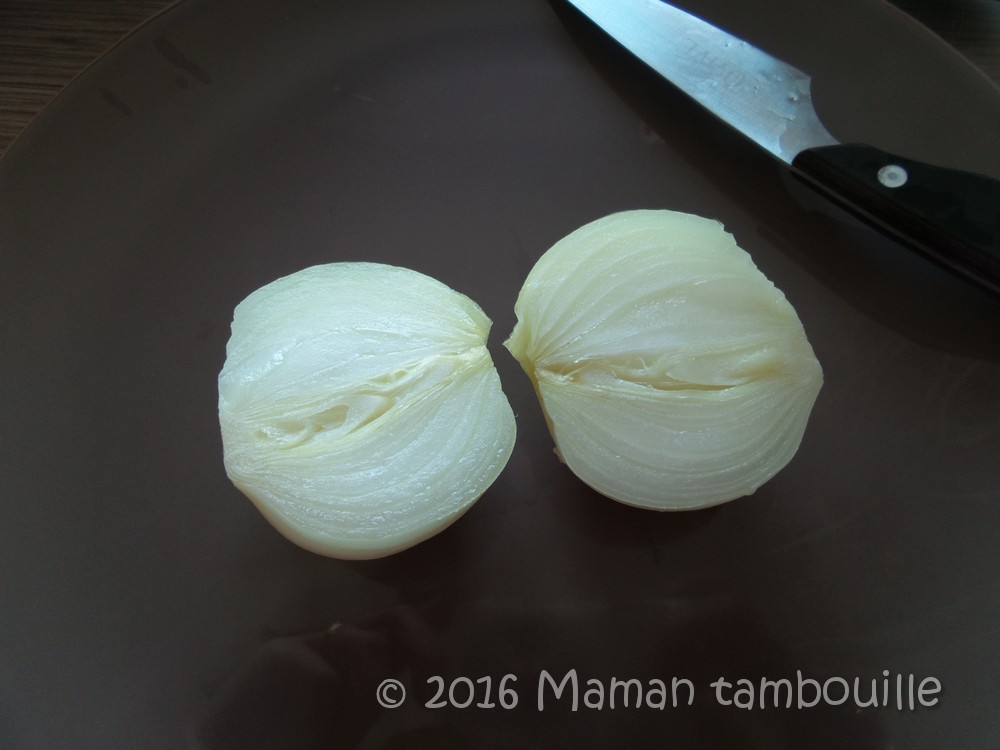 Eplucher les oignons puis les mettre à cuire entiers 10min dans une casserole d’eau bouillante.