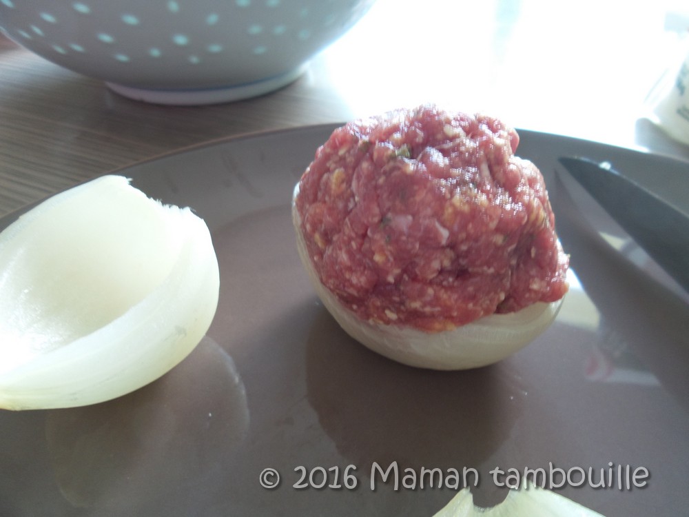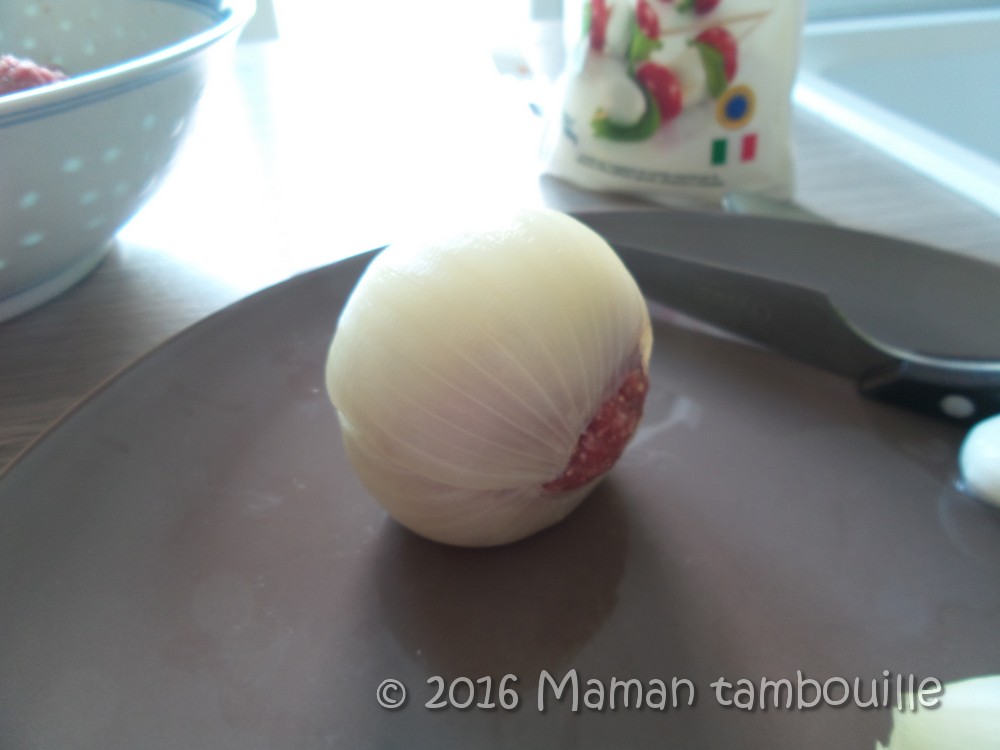Fermer la boulette de boeuf puis la déposer dans une coque d’oignon (on adapte la taille des boulettes de boeuf en fonction de la taille des oignons).