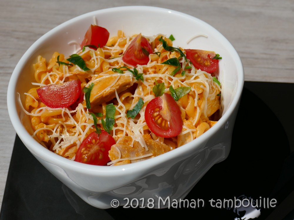 Dans une grande casserole, mettre les pâtes, le poulet, la crème, la sauce tomate, l’ail et un peu de sel.