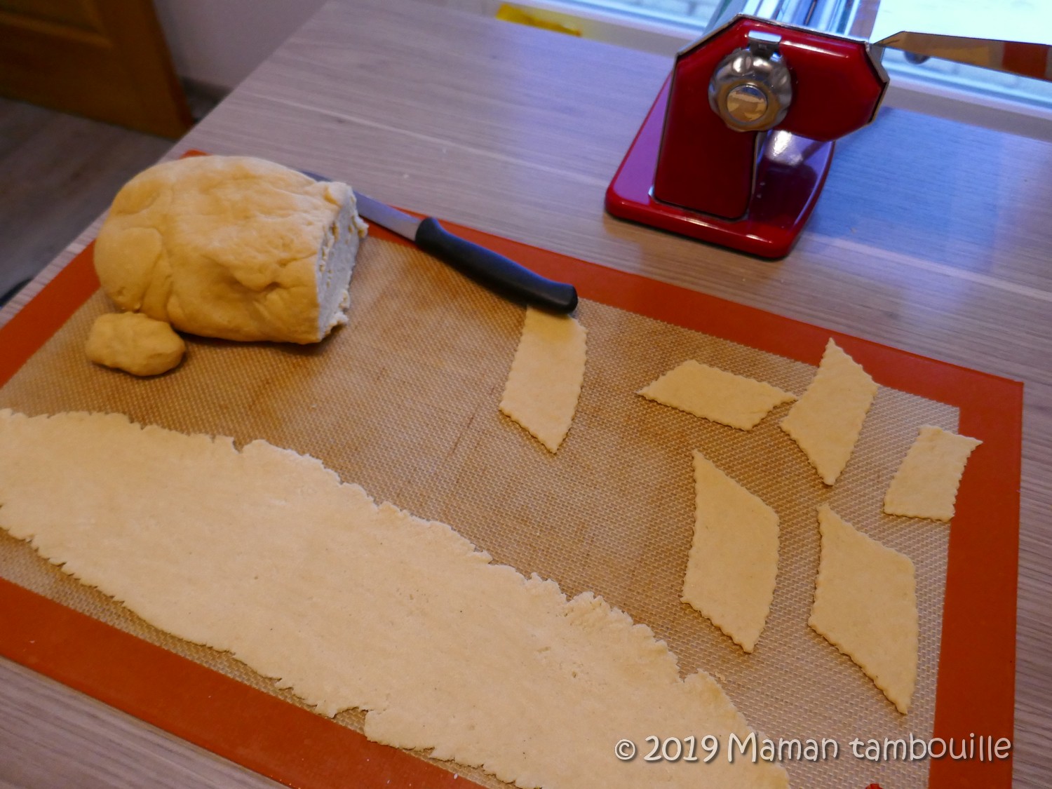 Le façonnage peut être fastidieux et très très long si vous les faites avec un rouleau à pâtisserie car la pâte doit être étalée très finement (sinon, bah, c’est plus des oreillettes, c’est des bugnes !). Mais, si vous avez un laminoir à pâtes, c’est le moment de le sortir du placard. La pâte est étalée finement en un rien de temps et sans effort ! Alors, elle est pas belle la vie ?!?