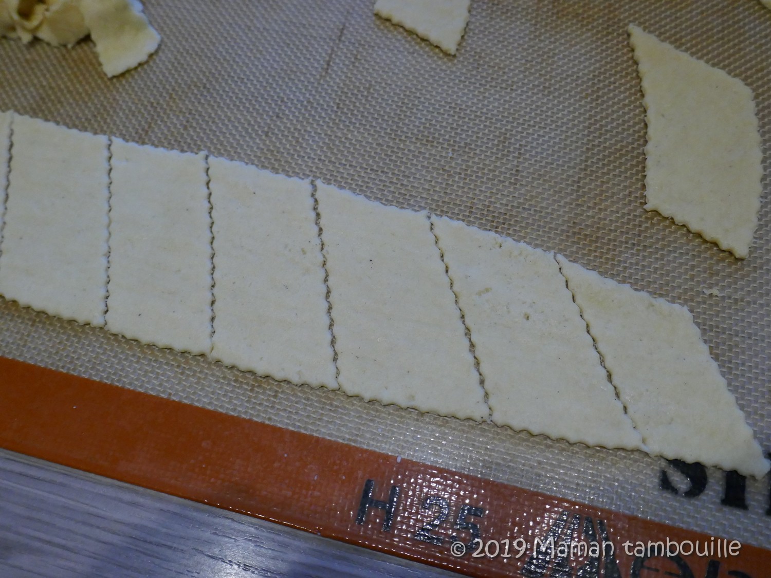 Poser la bande de pâte sur le plan de travail et couper des losanges à l’aide d’une roulette crantée.