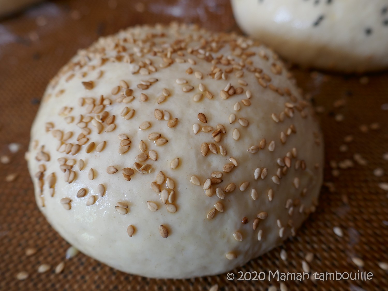 Badigeonner délicatement les pains au pinceau en prenant soin de ne pas faire couler de dorure sur le dessous. Une fois badigeonnés, faire un second passage et parsemer de graines de sésame ou autre.
