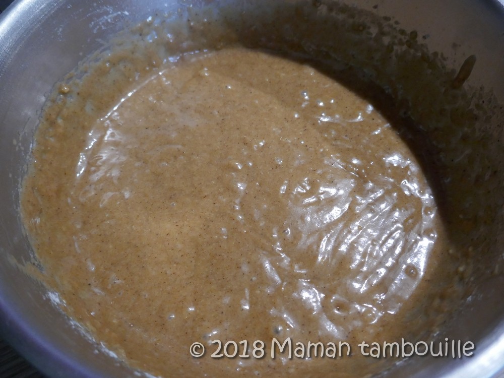 Verser en filet dans la farine tout en fouettant au batteur. Ne pas fouetter en excès, une fois qu’on a une pâte homogène et sans grumeaux, c’est prêt.