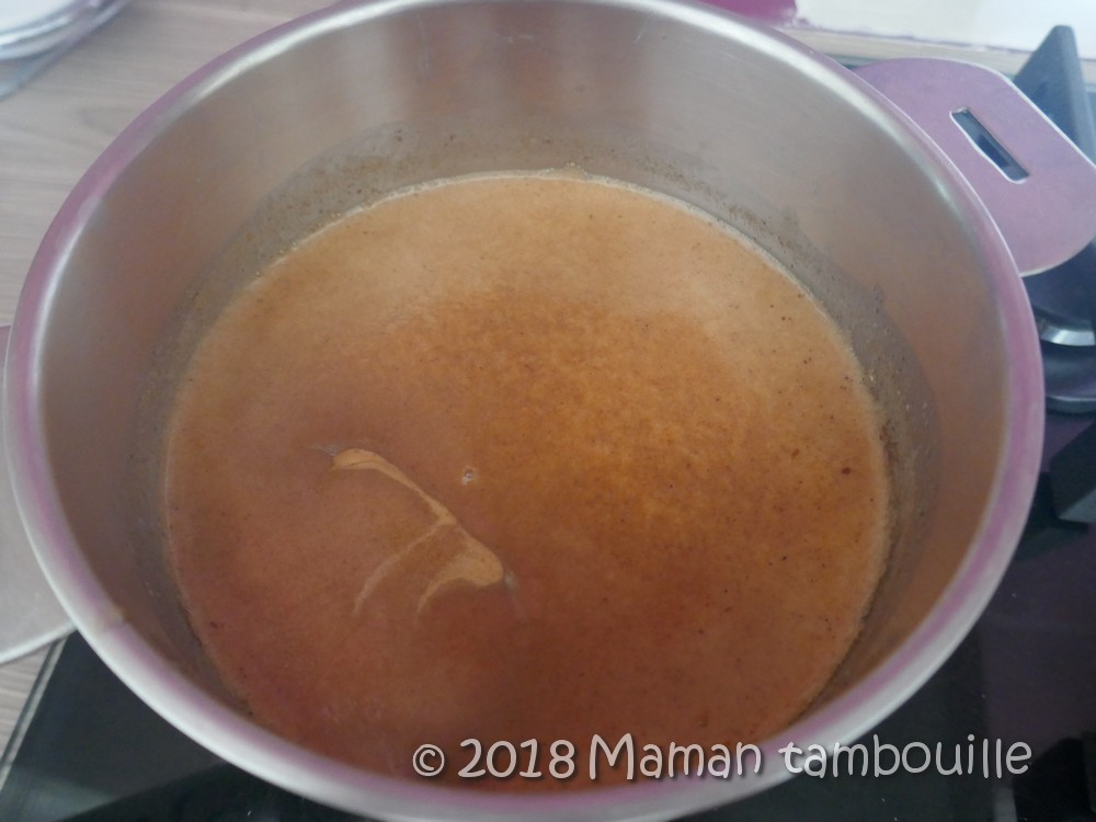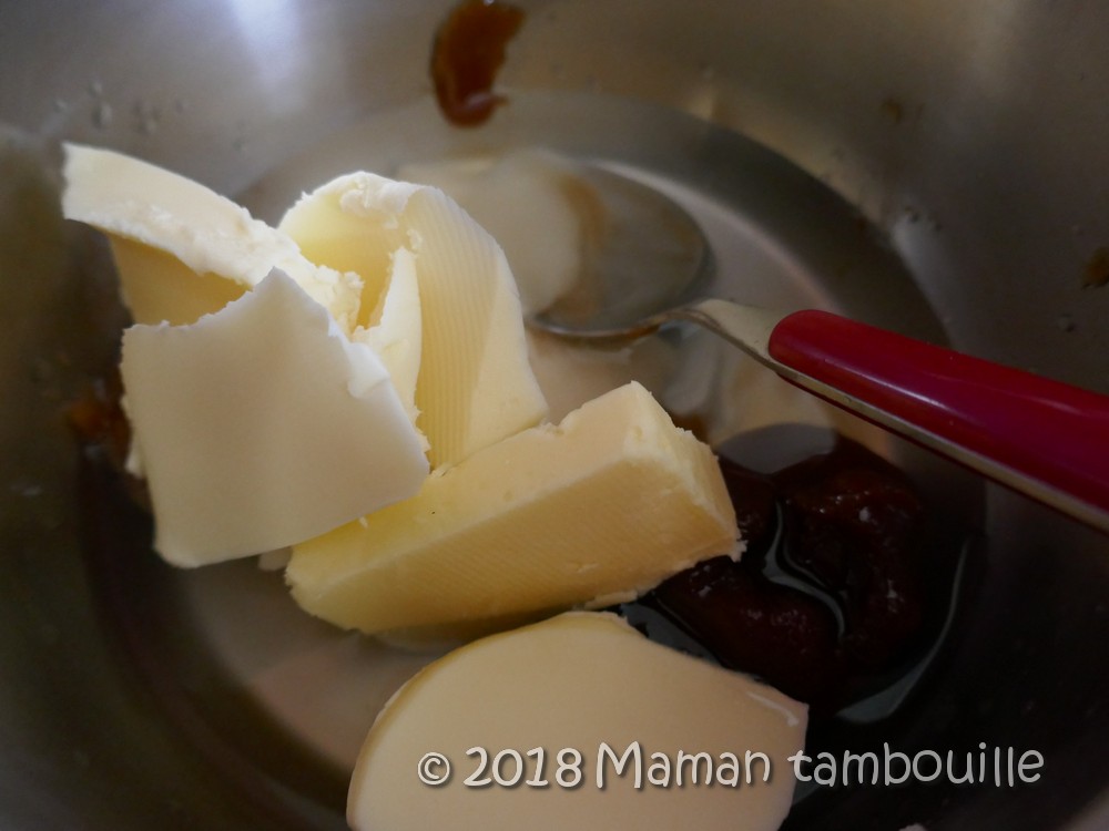 Dans une casserole, mettre l’eau, le miel, la cassonade, les épices et le beurre. Chauffer à feu doux pour bien tout dissoudre.