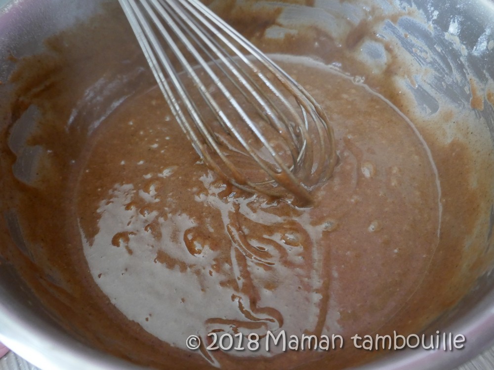 Verser le liquide dans la farine et mélanger au fouet pour ne pas avoir de grumeaux.