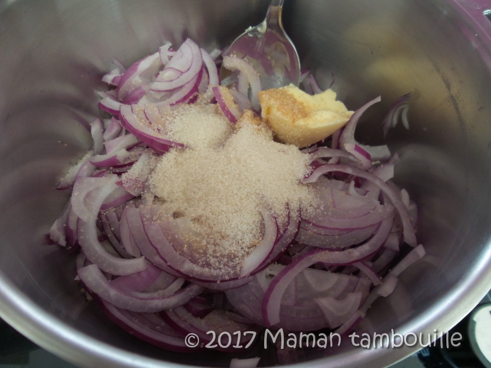 Chauffer en mélangeant pour faire fondre le beurre et dissoudre le sucre puis couvrir et laisser confire à feu très doux environ 15-20 min en mélangeant de temps en temps. Si ça commence à accrocher, ajouter un peu d’eau.