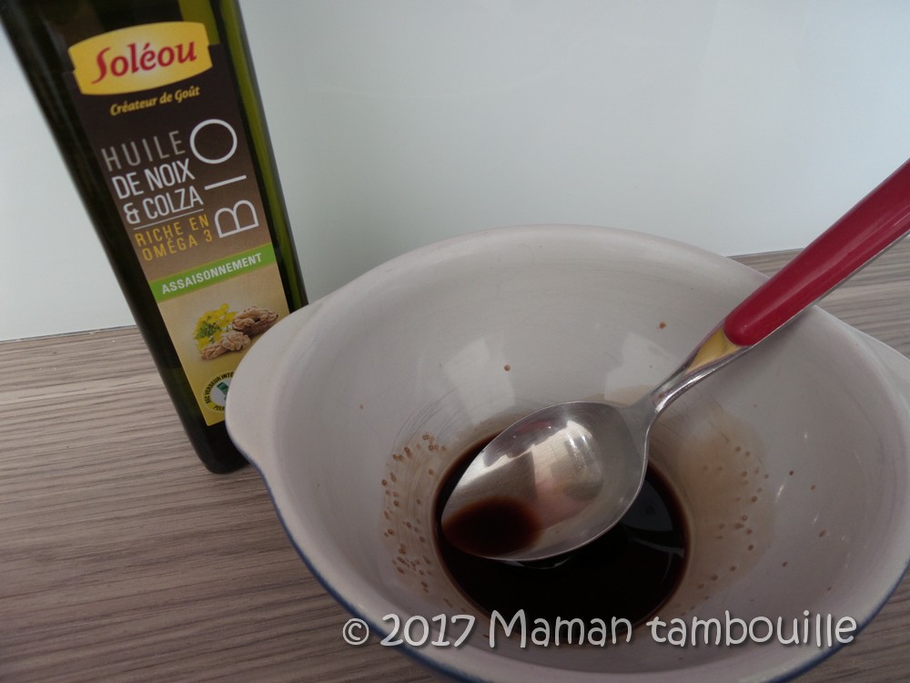 Préparer la vinaigrette en mélangeant 2 cuillères à soupe de vinaigre avec du sel et 6 cuillères à soupe d’huile de noix. Verser sur le kale, bien mélanger. Rectifier l’assaisonnement si besoin (sel/poivre) et réserver au moins 1h au frais.