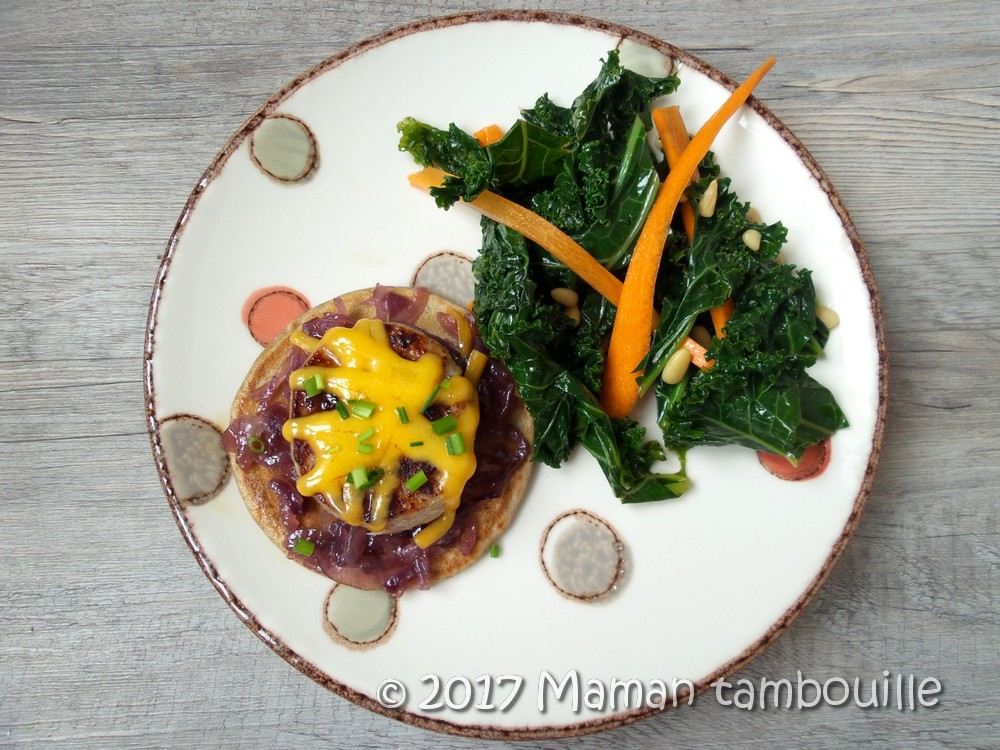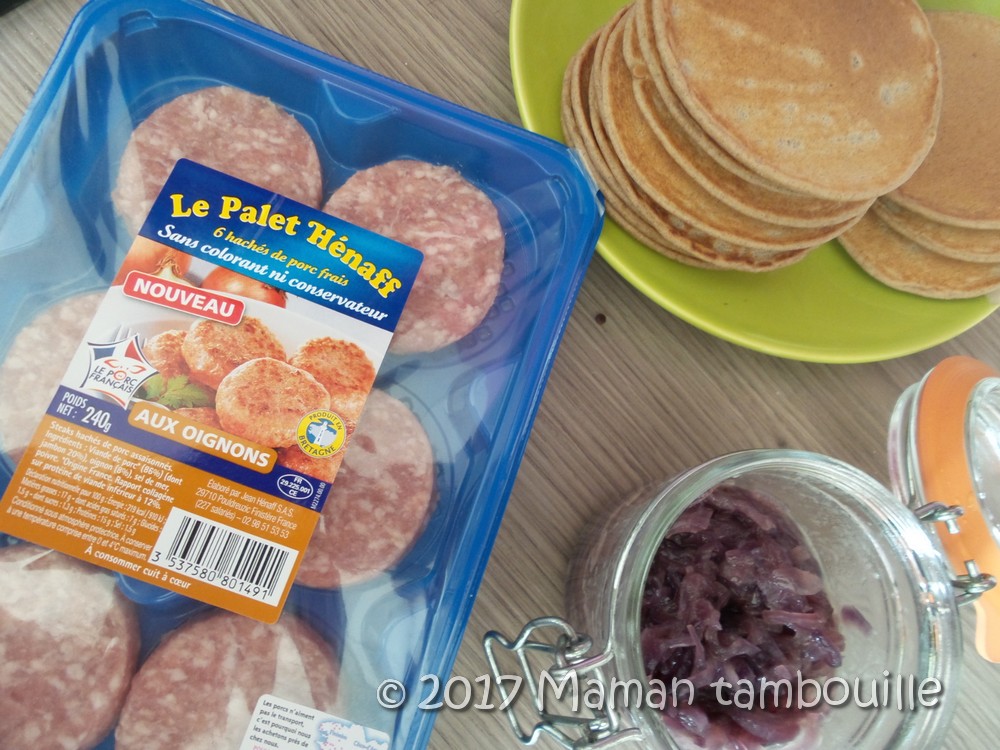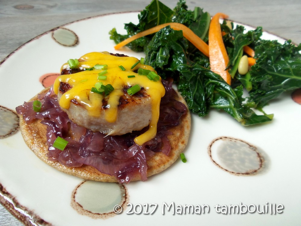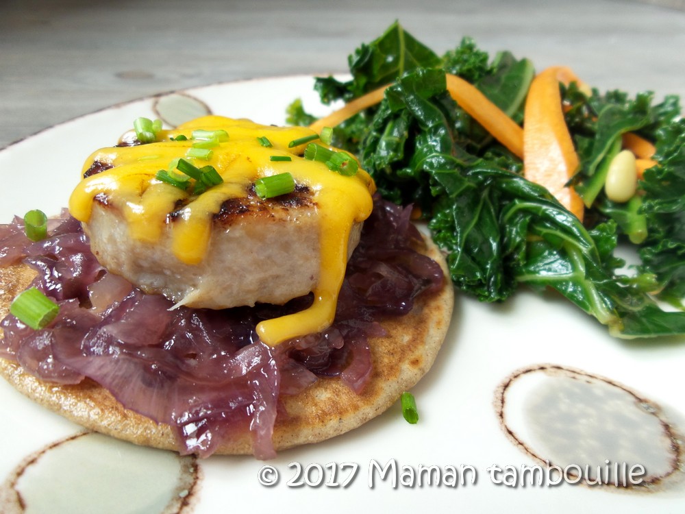 Je continue avec mes essais de charcuterie fraîche Henaff et, cette fois, je me suis penchée plus précisément sur les palets de porc aux oignons. J’ai choisi de les préparer sur un pancake de sarrasin, avec un confit d’oignons rouges, du cheddar fondu et une salade de chou kale pour accompagner le tout.