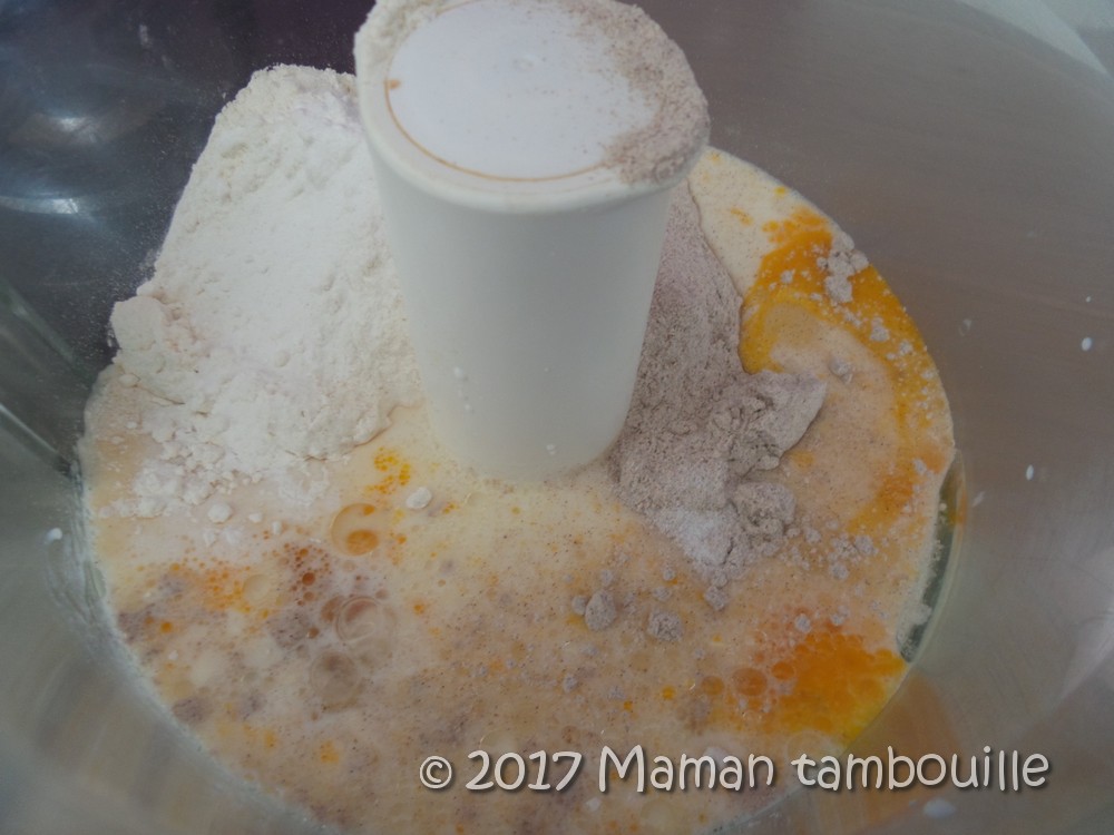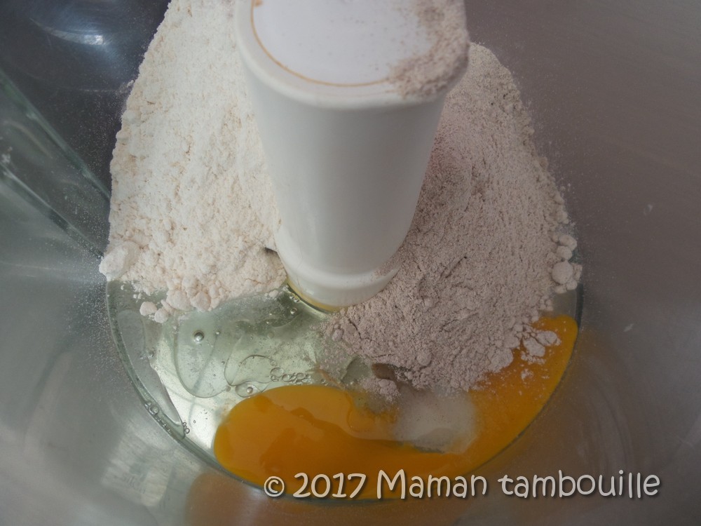 Dans le bol d’un robot mixeur, mettre l’oeuf, les farines, une cuillère à café de sel, la levure et l’huile.