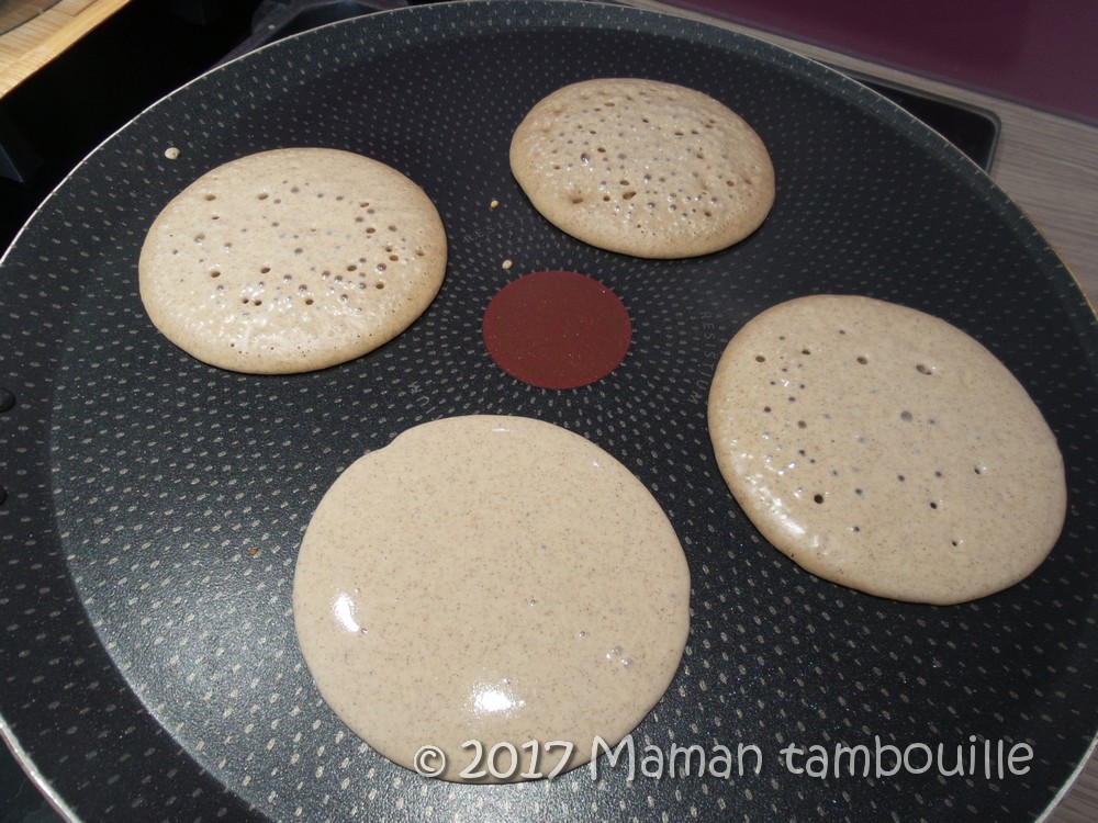 Y verser des louches de pâte et cuire à feu moyen/doux. Quand des bulles se forment en surface, retourner les pancakes et cuire environ 1 min sur l’autre face.