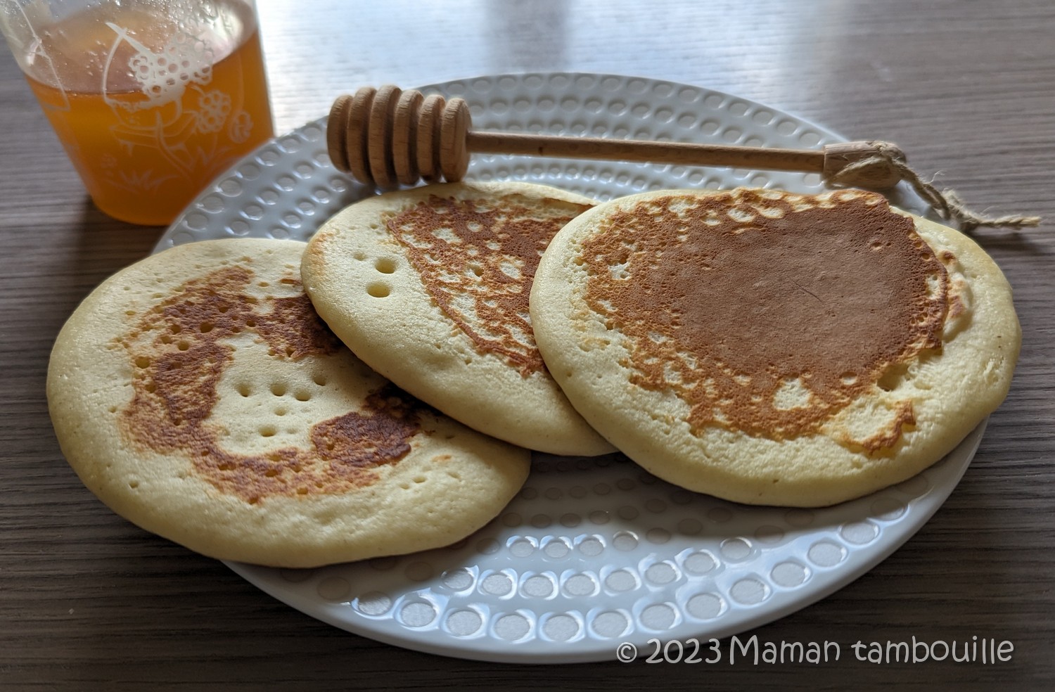 Reste la dernière étape, la cuisson. On chauffe une poêle et on graisse légèrement. Verser de petites louches de pâte sans étaler. Laisser cuire à feu moyen chaque pancake, retourner dans le dessus commence à buller puis cuire l’autre face rapidement.