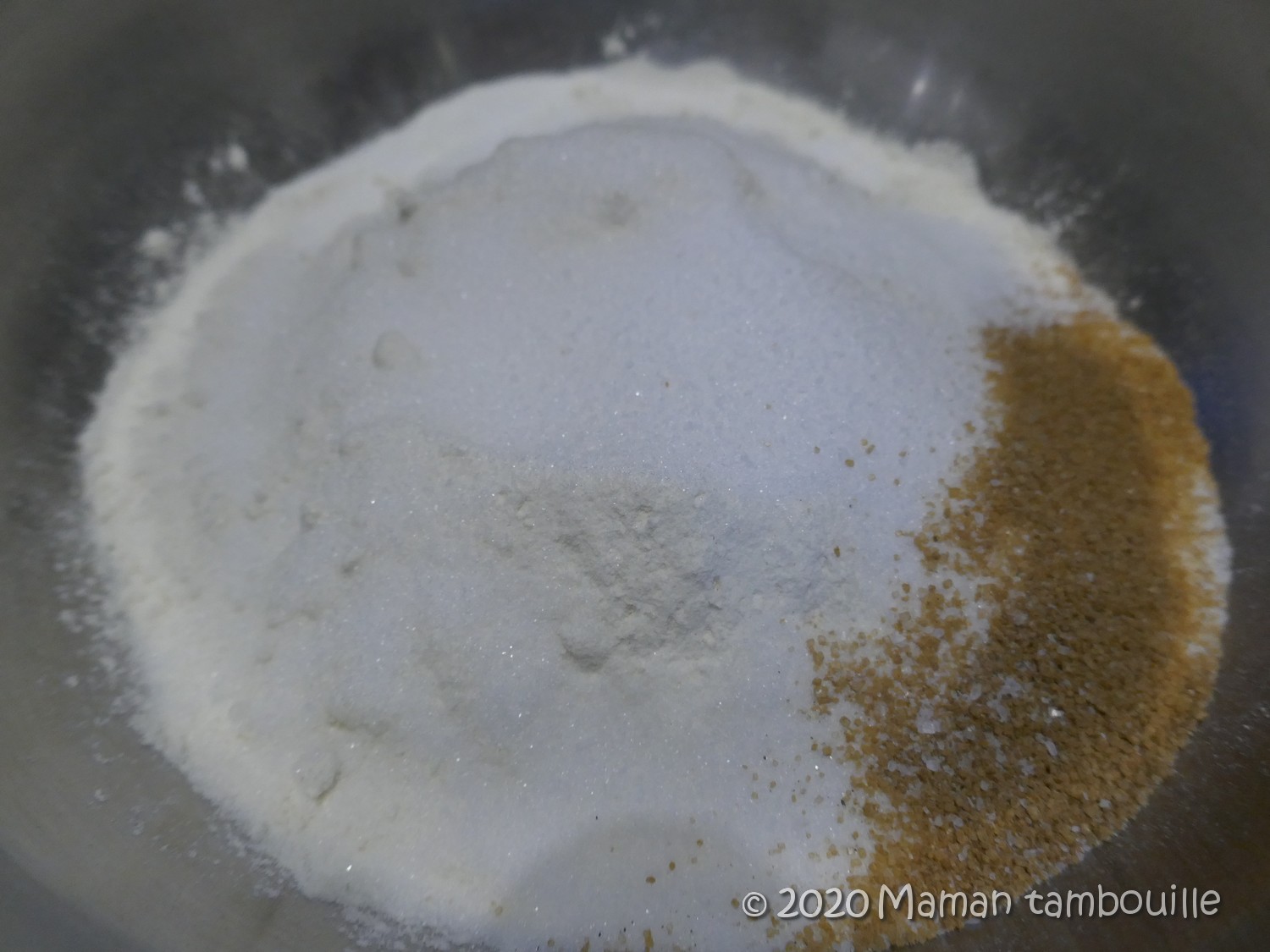 Dans un saladier, mettre la farine, les sucres, la levure, le bicarbonate et du sel. Mélanger.