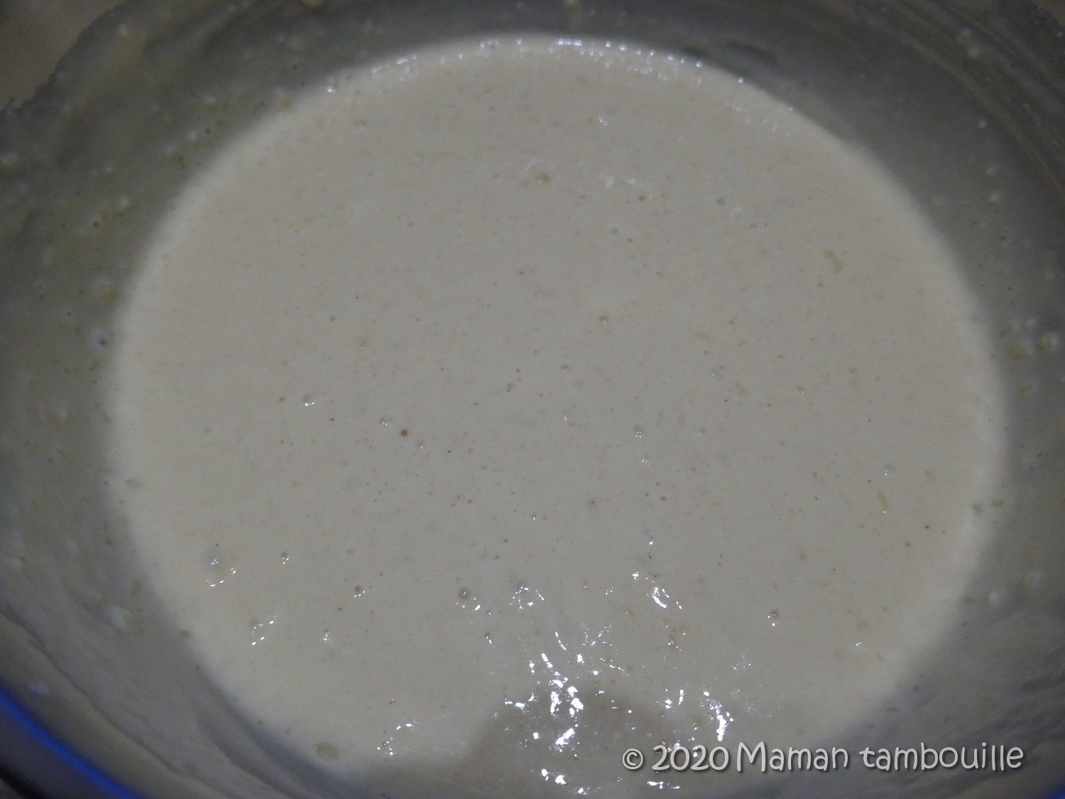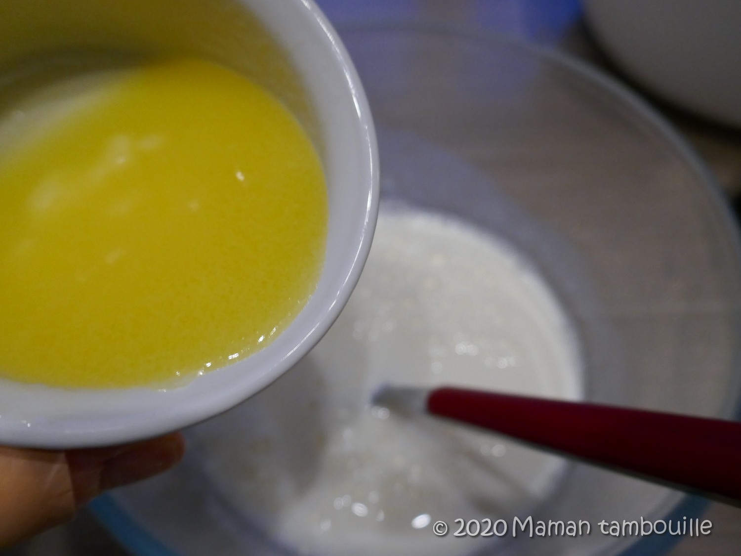 Ne pas trop fouetter, dès que le mélange est homogène, c’est bon, même s’il y a des grumeaux, c’est pas grave.