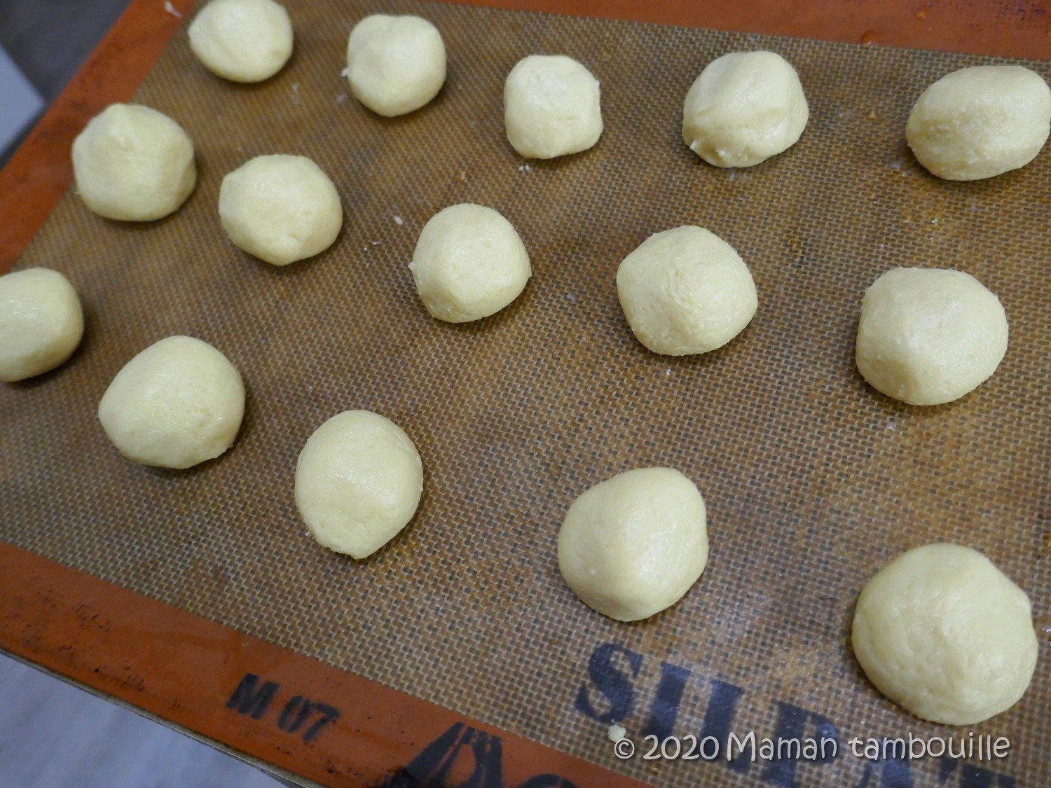 Se mouiller les mains et former des boulettes de la taille d’une grosse noix. Poser sur une toile de cuisson. Ne pas hésiter à se mouiller les mains régulièrement pour ne pas que la pâte colle aux mains.