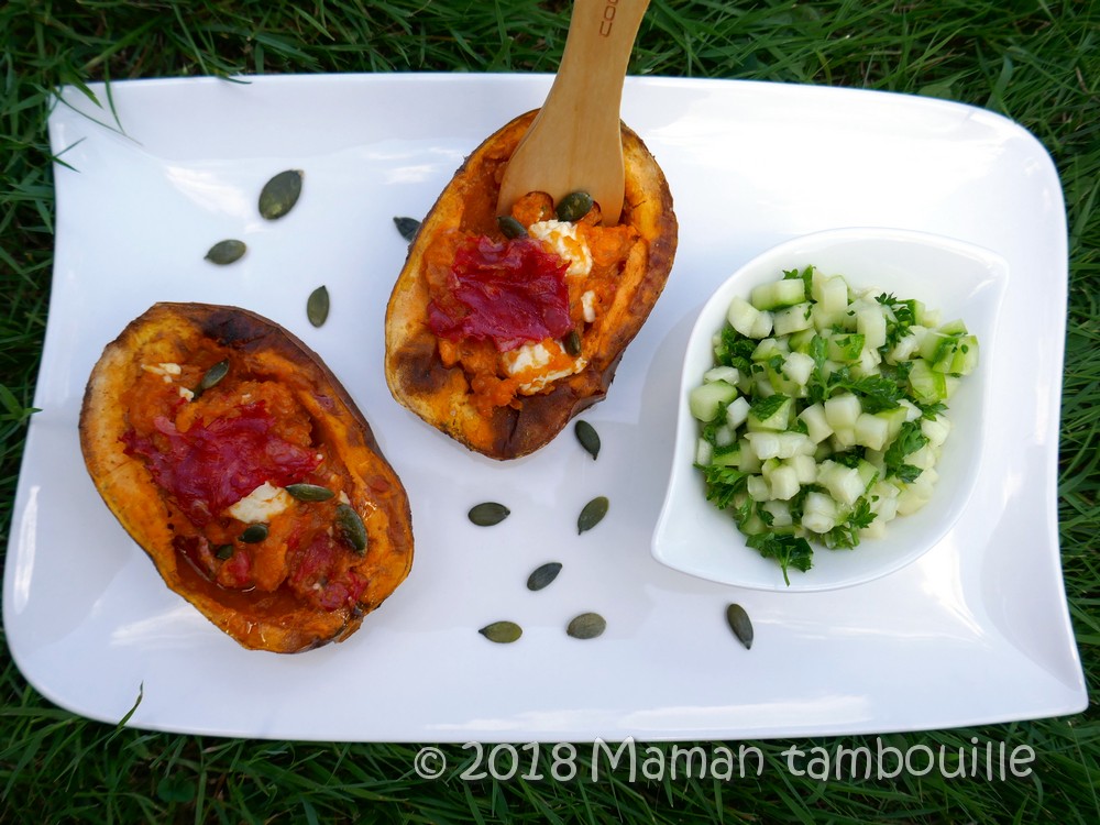 Alors ça c’était carrément trop bon ! J’aime les patates douces, ça change un peu. Mon fils l’adore en purée, moi je la préfère rôtie au four. Là, c’est un peu un mix des 2: les patates cuites au four, l’intérieur creusé et écrasé en purée avec de la feta, du chorizo et des graines de courges.