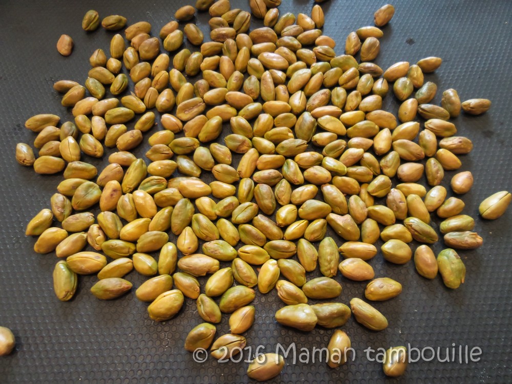 Etaler les pistaches sur une plaque et enfourner 10 min à 150° pour les torréfier. Elles ne doivent pas trop brunir (j’ai laissé un peu trop longtemps au four et mes pistaches ont perdu leur couleur verte, le goût est tout aussi bon mais c’est moins joli au final).