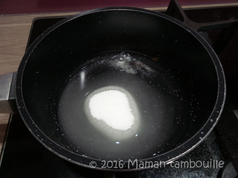Dans une casserole, mettre le sucre et l’eau. Faire chauffer jusqu’à 121°.