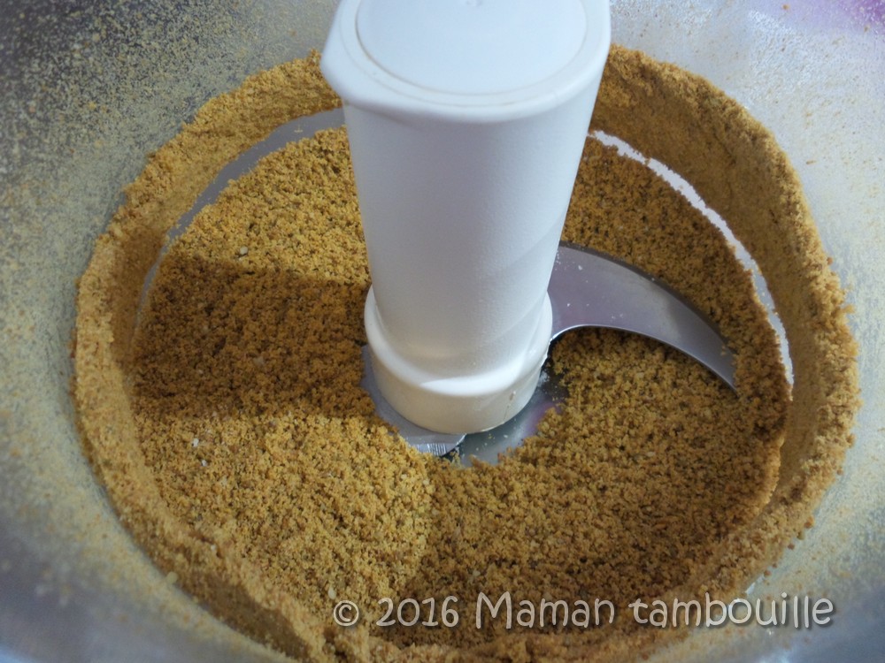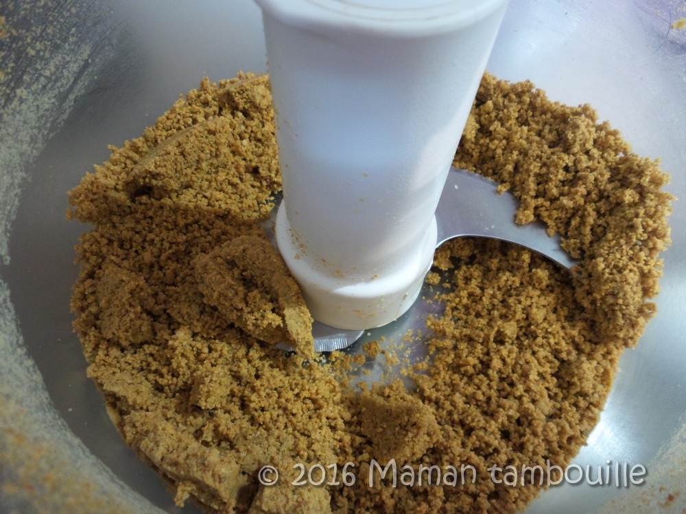 Mixer. On commence par obtenir une poudre. Mélanger avec une spatule pour racler le fond et les bords puis mixer à nouveau.