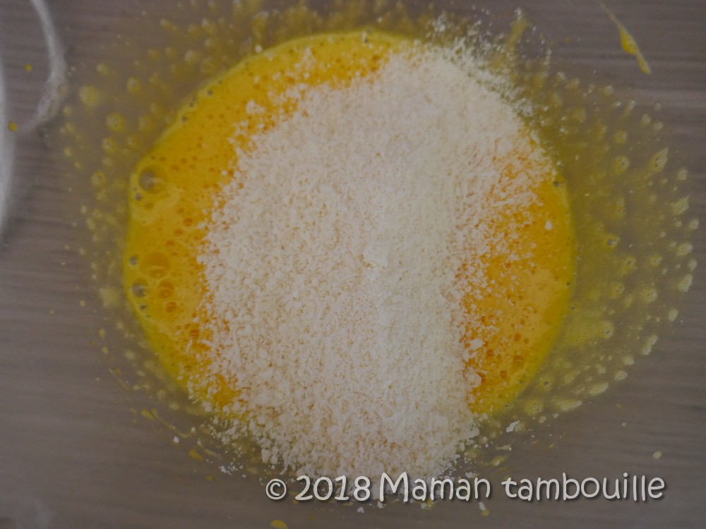 Battre les jaunes pour qu’ils blanchissent un peu puis ajouter 40g de parmesan et saler. Fouetter à nouveau.