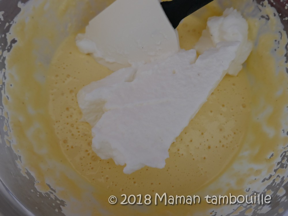 Mettre une grosse cuillère de blanc en neige dans le mélange de mascarpone et incorporer assez vivement avec une spatule pour détendre la crème.