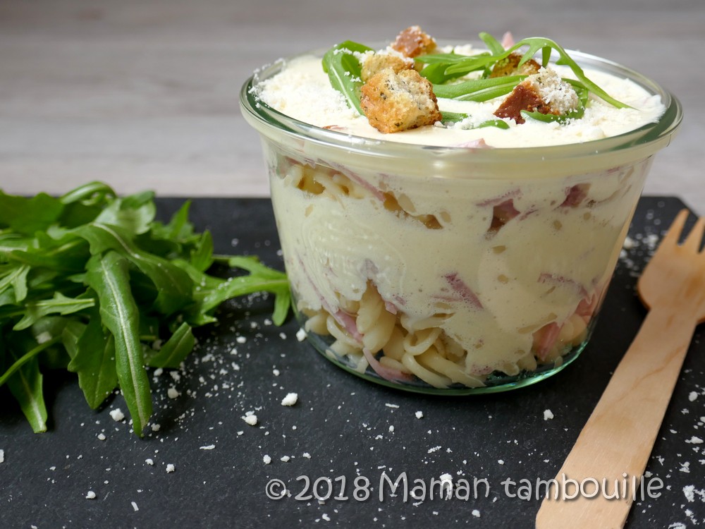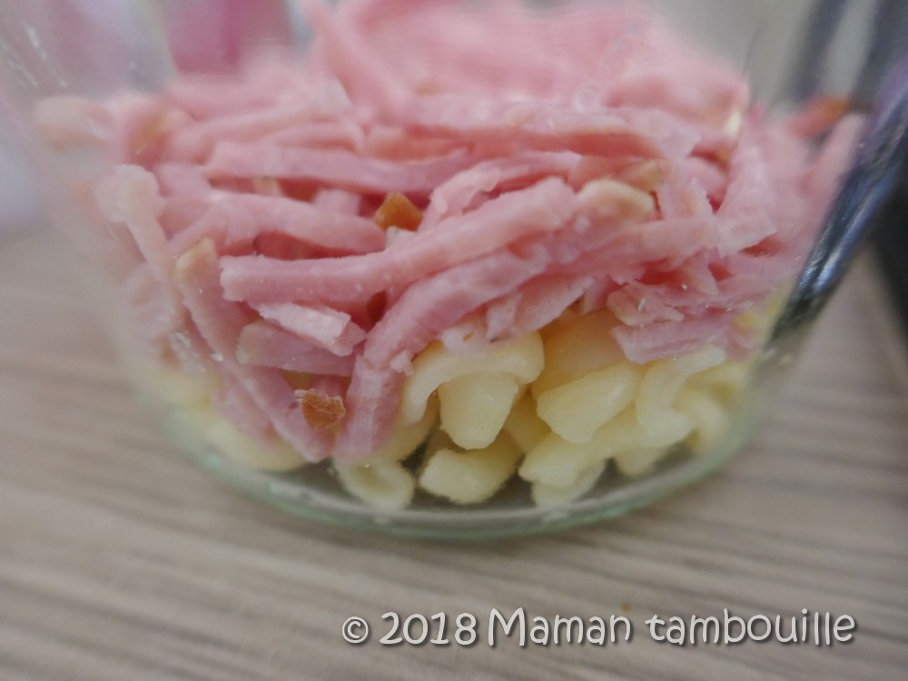 Pour le montage, mettre dans un bocal ou une grande verrine une couche de pâtes froides puis une couche de jambon.
