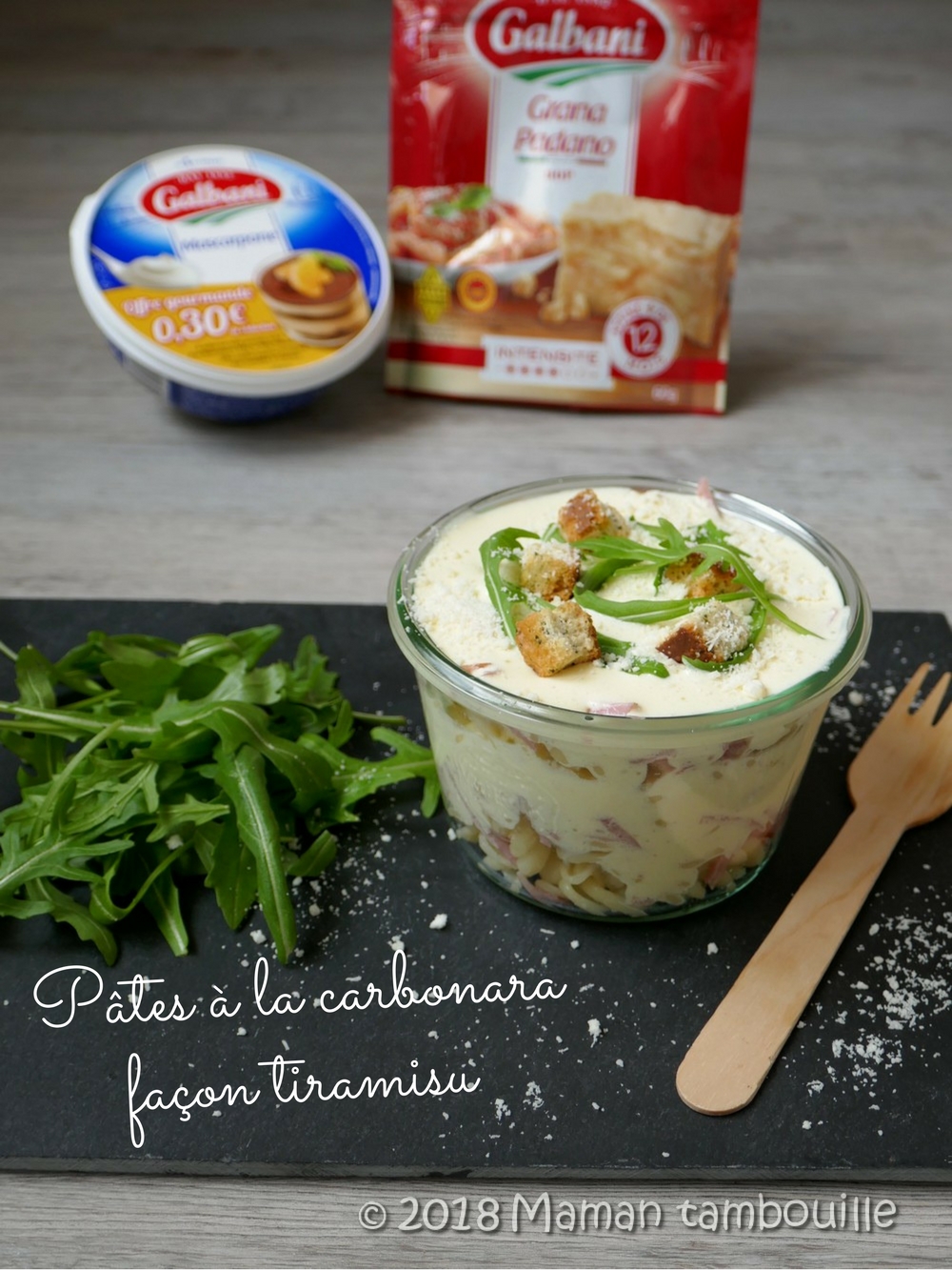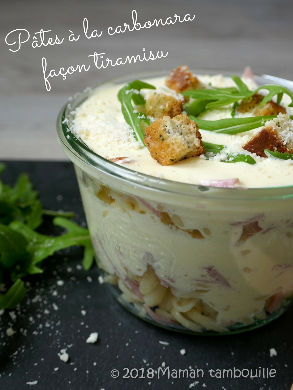 Et pourquoi pas des pâtes à la carbonara façon tiramisu !?! Un coup d’oeil sur internet en cherchant « pâtes à la carbonara tiramisu », aucun résultat probant, cool voilà une idée de recette qui ne semble pas déjà exister, c’est parti, je me lance !