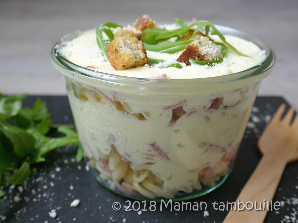 Mon grand a tout de même trouvé que chaud ça devrait bon aussi alors on a essayé de faire une verrine chaude. Et bien, non non et renon, il ne faut pas le servir chaud. Comme je le craignais (et c’était évident !), la crème est retombée sous la chaleur des pâtes. Alors, le goût était là mais la texture de tiramisu a disparu, bref on se retrouve avec des pâtes à la carbonara classiques ! C’est donc définitivement froid que ce plat doit être dégusté.