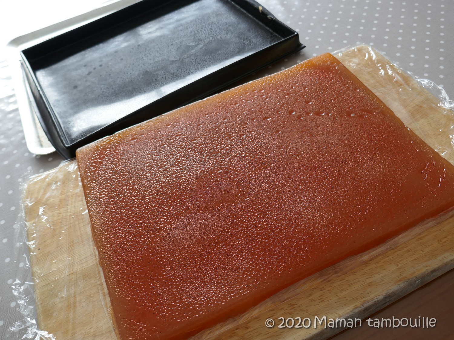 Au bout de 5 min de cuisson, verser dans un moule anti adhésif (le flexiplat pour moi). Lisser la surface et laisser refroidir une nuit à température ambiante.