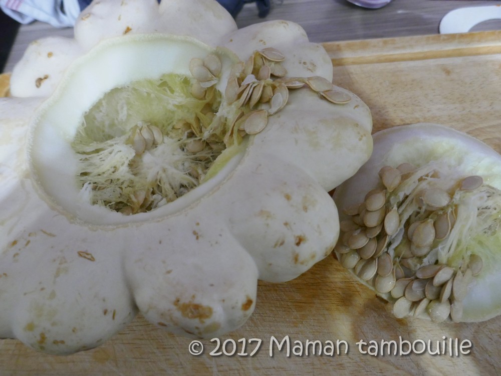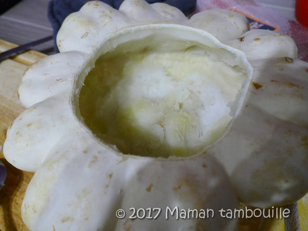 En grands consommateurs de courge, il en est une que nous n’avions pas encore testé: le patisson. J’ai toujours trouvé cette courge super jolie, on dirait une marguerite ! Dernièrement, je me suis décidée à en acheter une. Comme c’était un coût « à la pièce » et que nous sommes 5 gourmands, j’ai pris la plus grosse … c’était une erreur !
