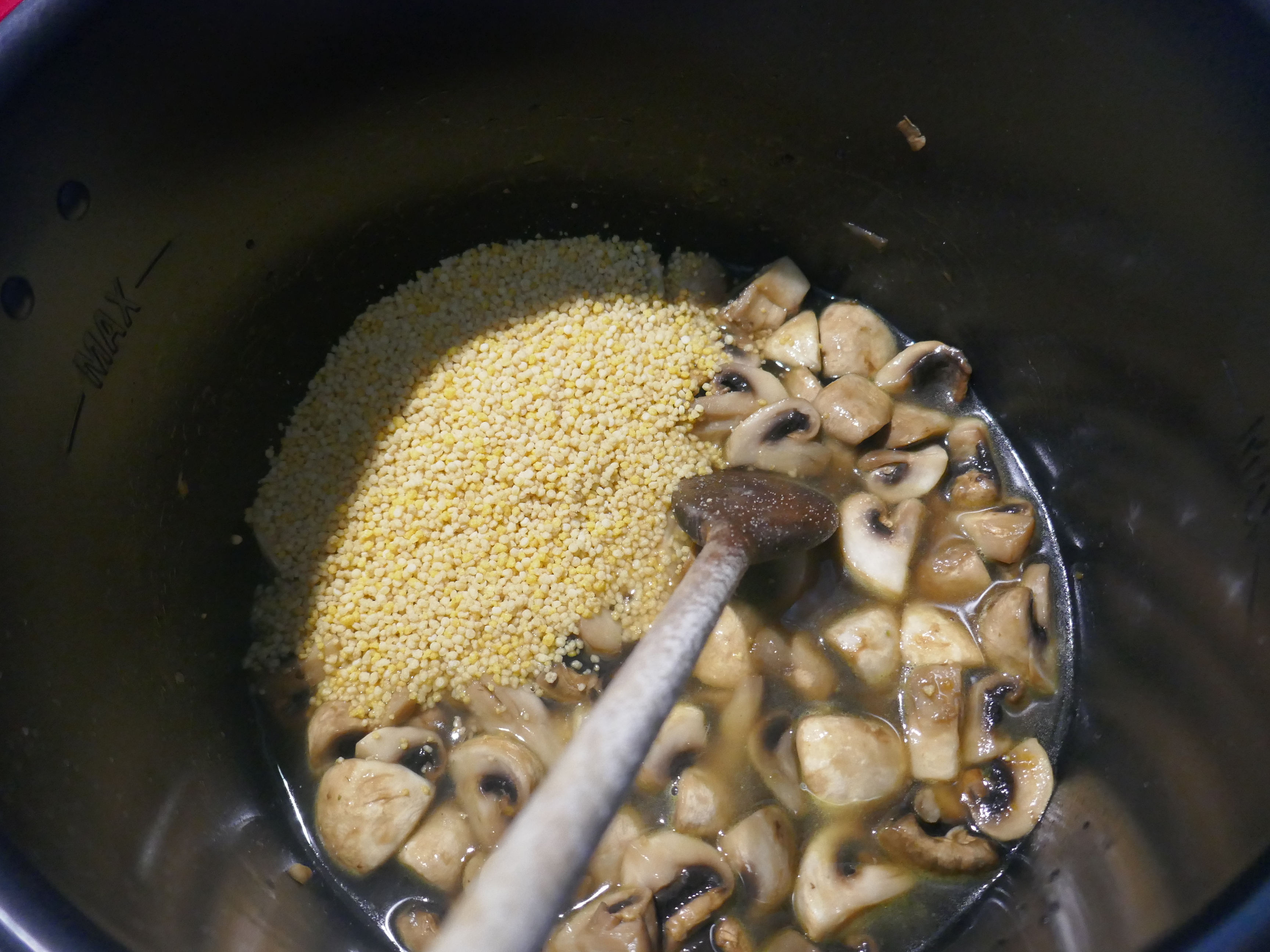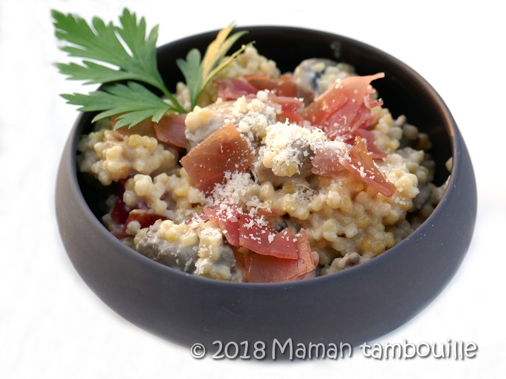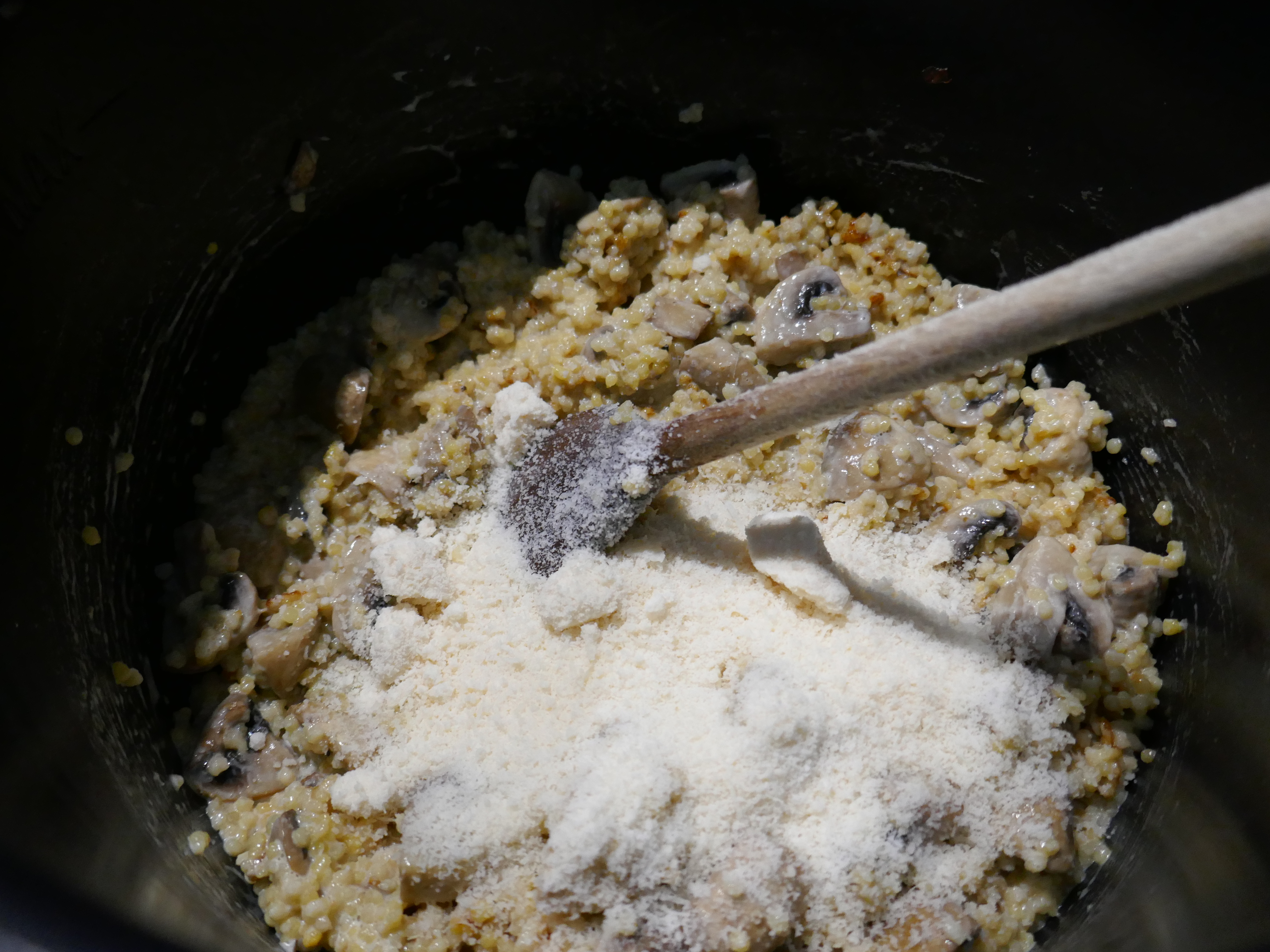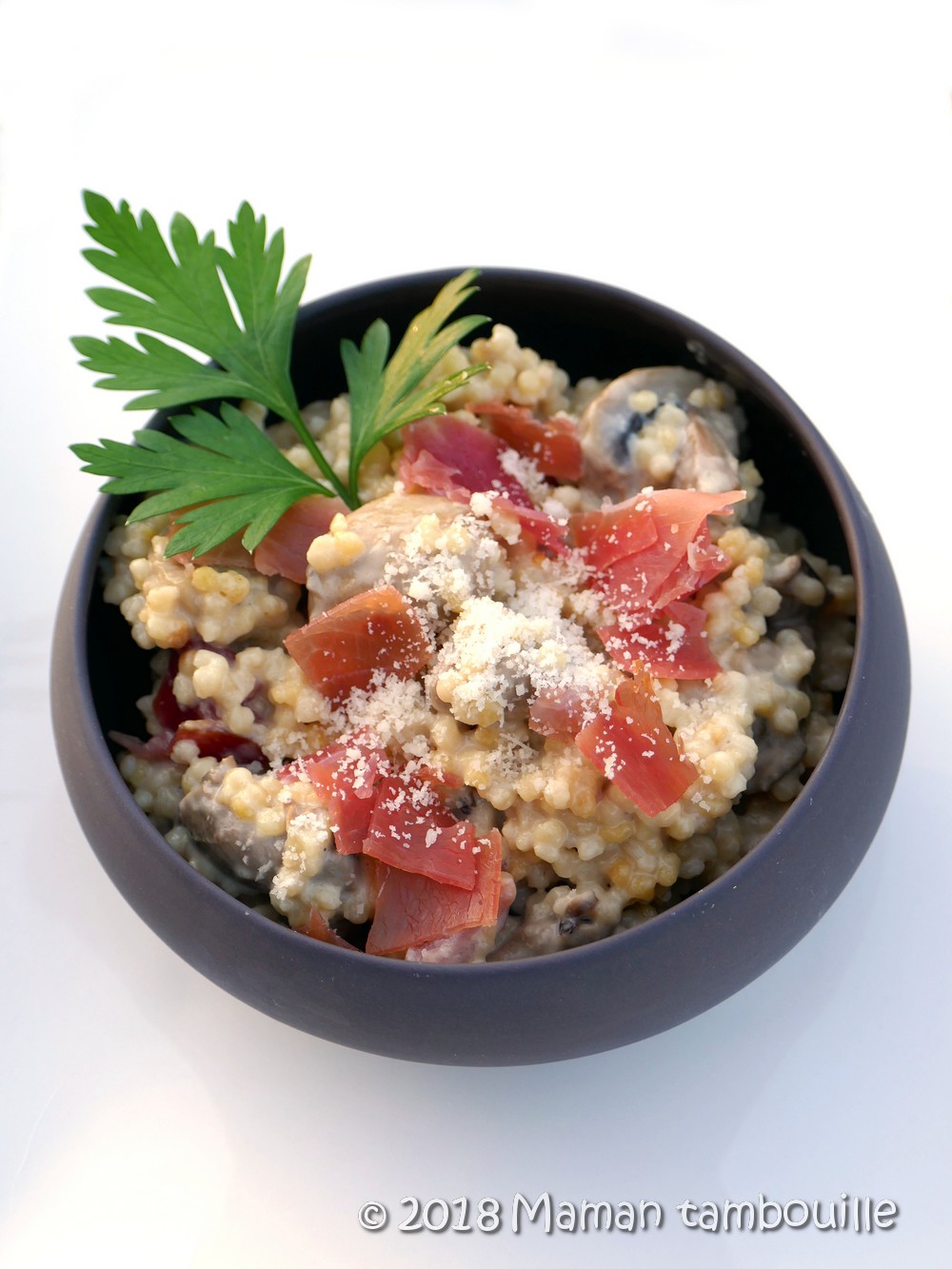 Un plat improvisé pour un soir avec ce que j’avais sous la main. En priorité, 500g de champignons frais à utiliser. Je fouille un peu et je tombe sur une boite de « tendres perles de blé Tipiak », ça fera l’affaire pour accompagner les champignons. On ajoute à cela du jambon serrano émincé, de la crème et du parmesan et nous voilà avec un plat un peu façon risotto. Pour plus de rapidité, je l’ai fait au cookeo mais on peu bien sûr faire sans.