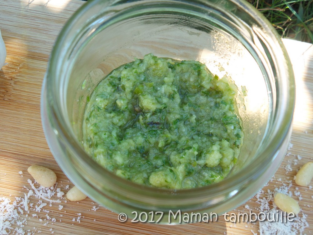 Pour ma première récolte, j’ai tenté un pesto au basilic, un grand classique quoi. J’y ai mis du basilic, des pignons de pin, du parmesan, de l’ail et j’ai remplacé l’huile d’olive par l’huile de noix et colza Soléou.