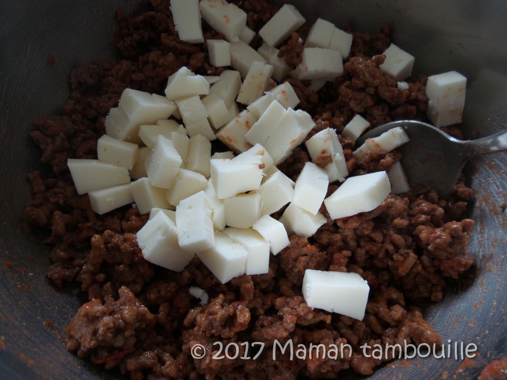Couper la mozzarella en cubes et l’ajouter au boeuf. Mélanger.