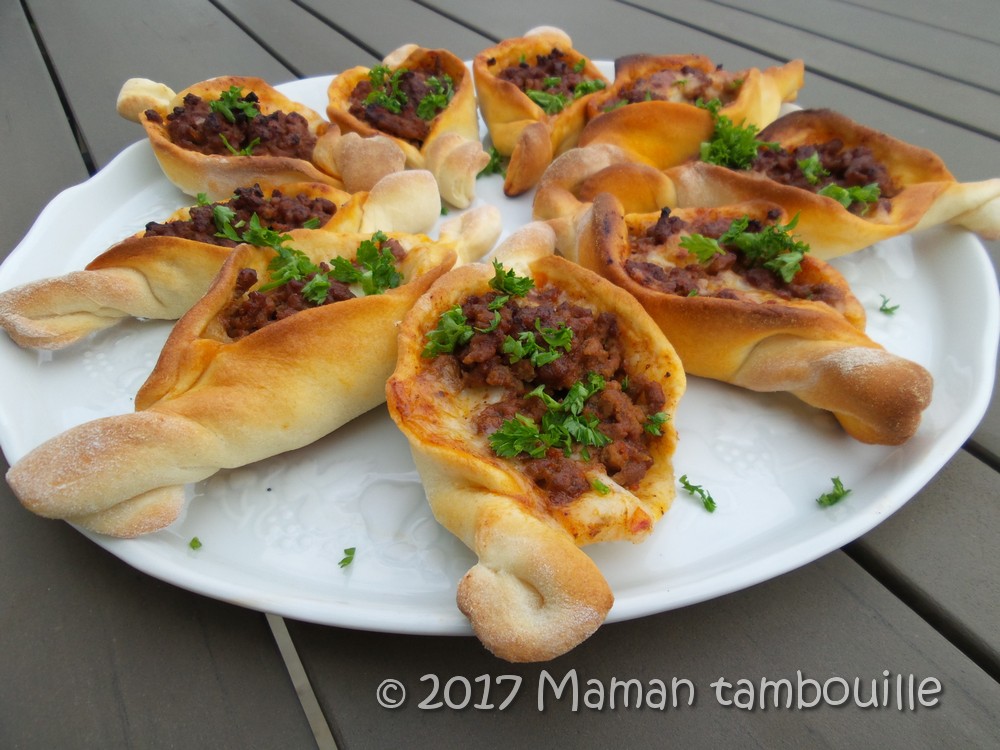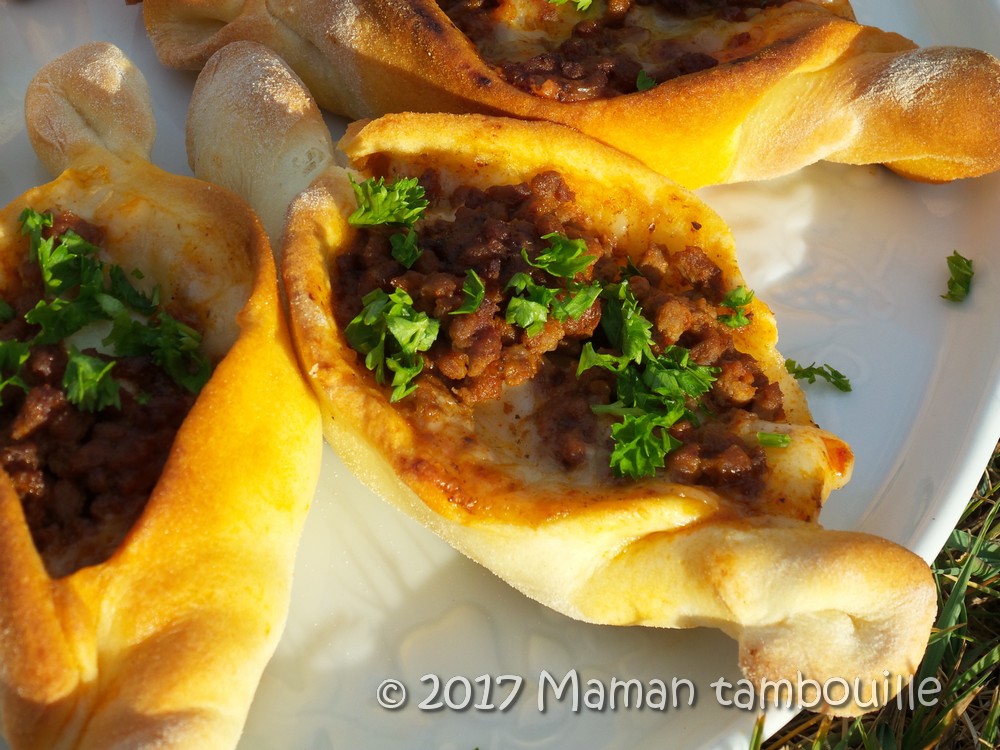 Première fois que je faisais des pides, ces petites pizzas turques en forme de petit bateau. Ce n’est pas très compliqué à faire: une sorte de pâte à pizza, une garniture et on enfourne.