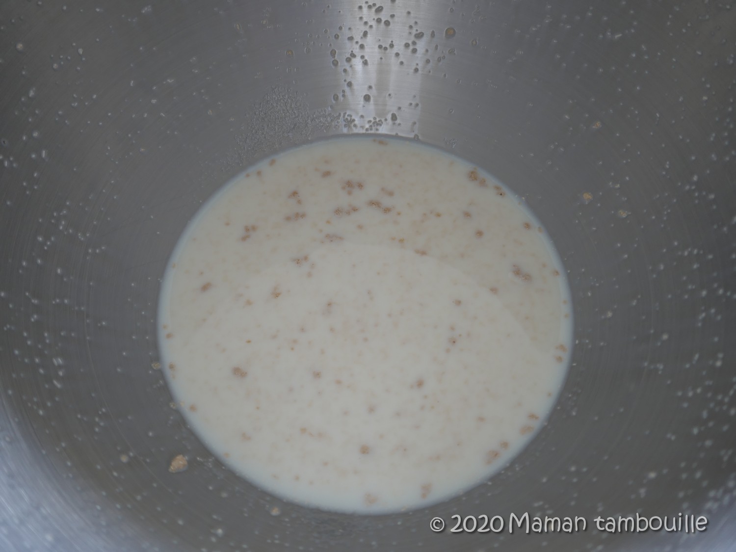 Dans le bol d’un robot avec le pétrin, mettre le lait juste tiédi et la levure. Laisser 5 min.