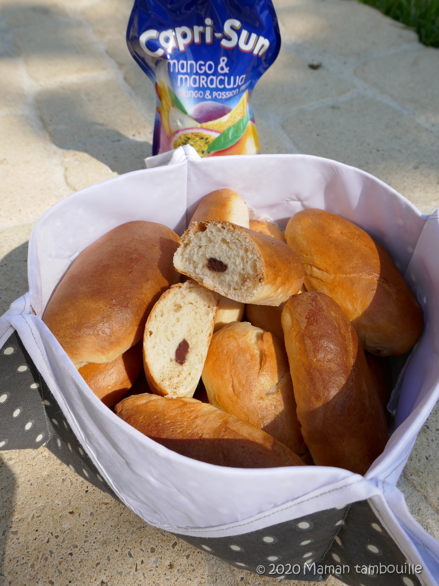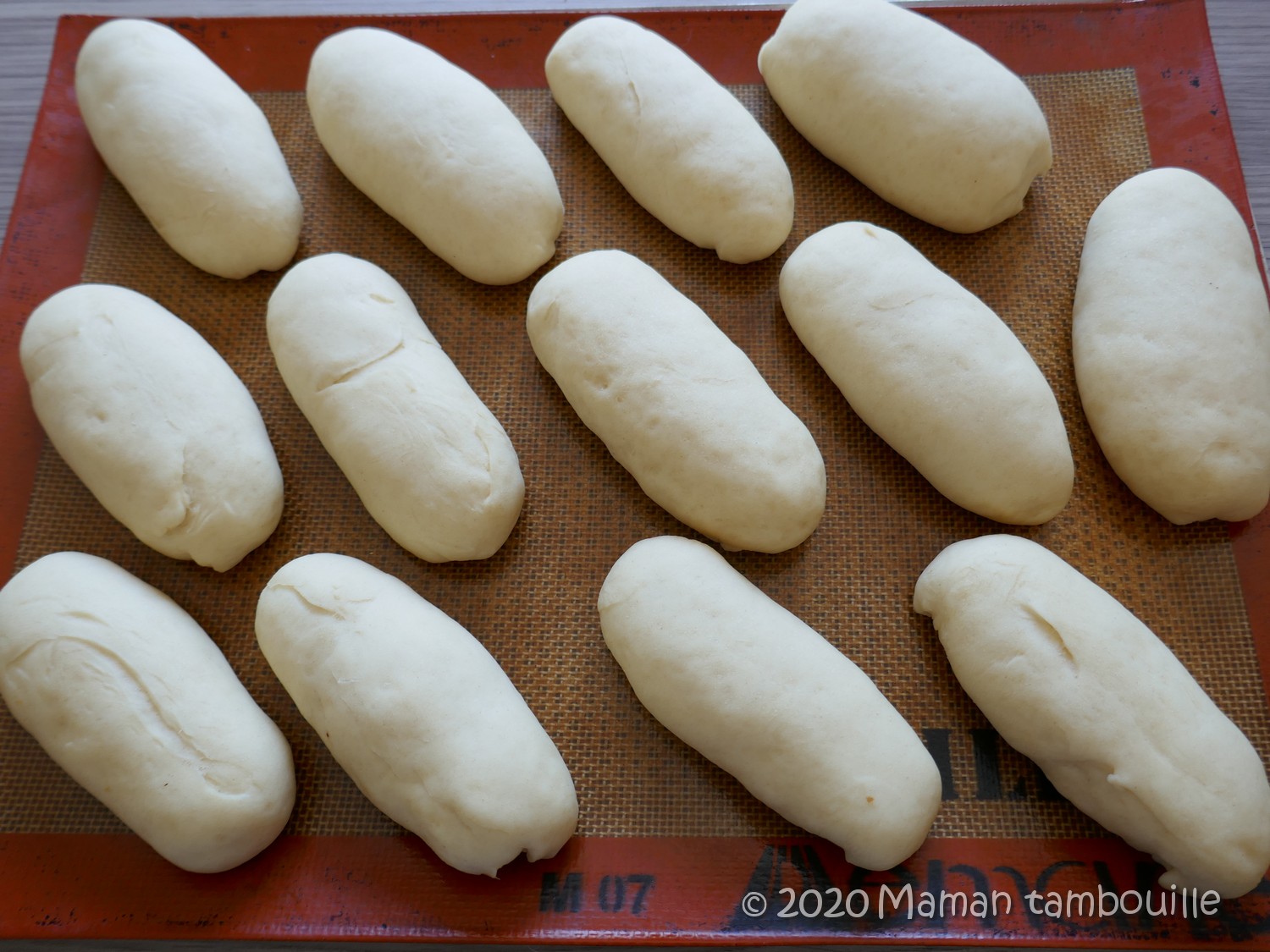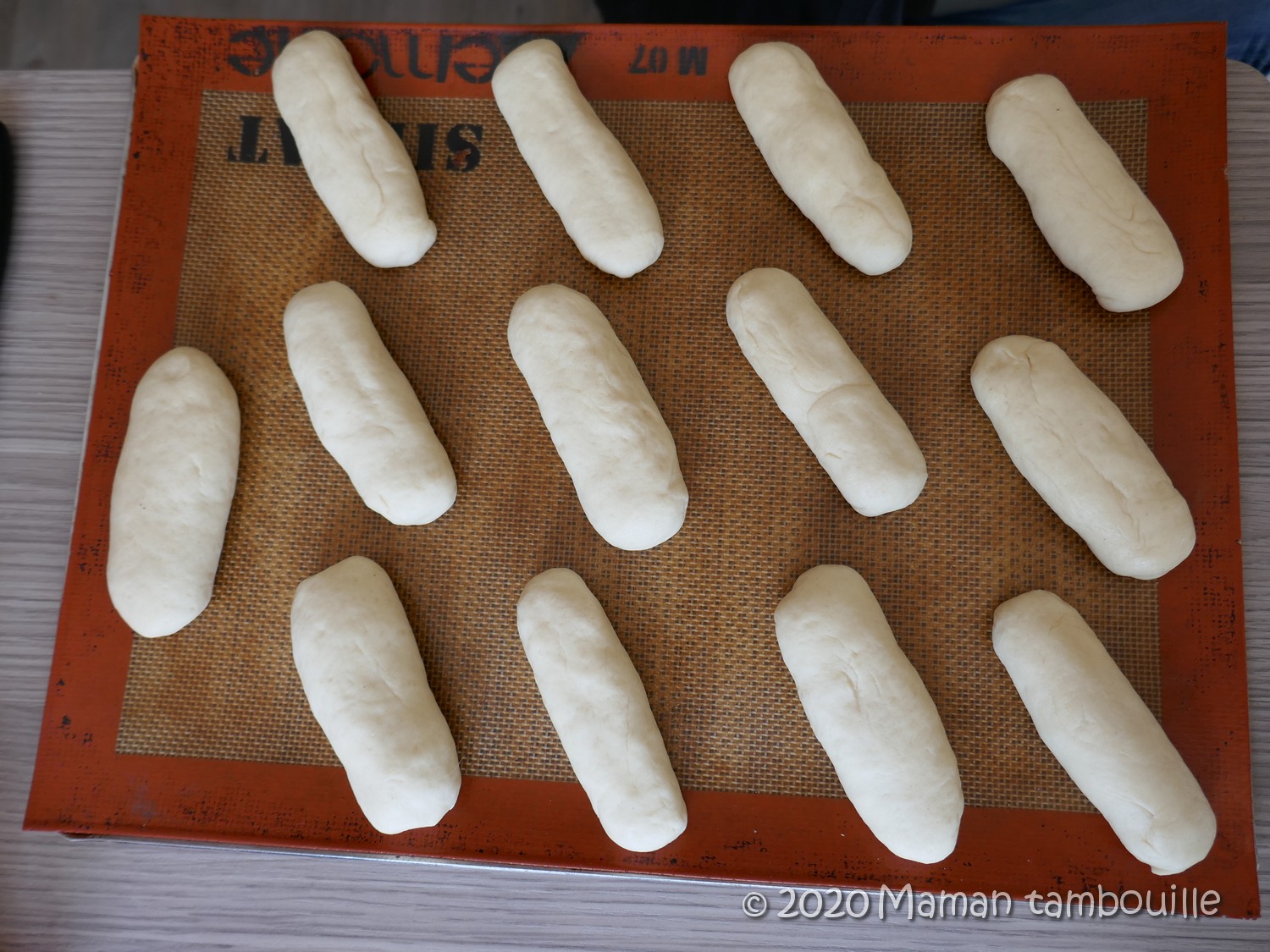 Séparer la pâte en pâton d’environ 50g. Les aplatir un peu en ovale, poser un bâton de chocolat et refermer les petits pains en pinçant bien la soudure. Les poser, soudure en dessous, sur une toile silpat. Laisser lever 45 min.