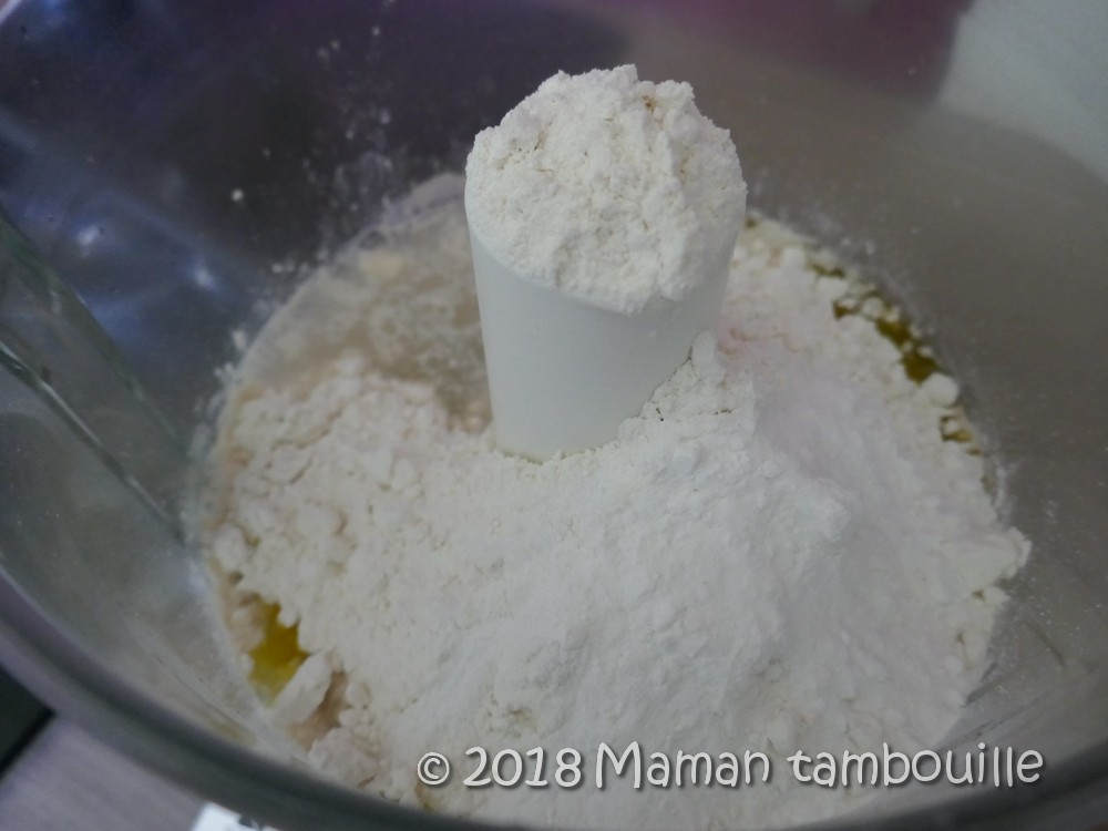 Dans le bol d’un robot mixeur, mettre l’oeuf, l’huile, l’eau tiède et la levure de boulanger.