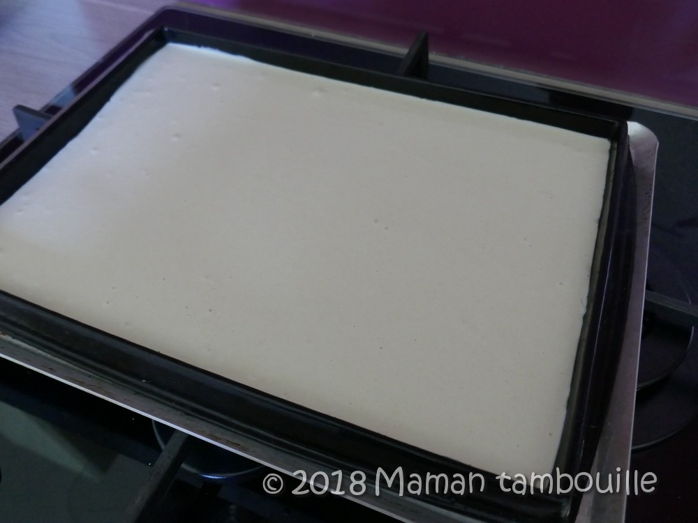 Verser dans un grand moule anti adhésive (le moule Moule flexipan plat Guy Demarle pour moi posé sur une plaque perforée. Ce moule fait 23cm x 33 cm, il ne faut pas prendre plus petit, vous pouvez même prendre un peu plus grand si vous voulez une pâte moins épaisse). Répartir sur la surface.