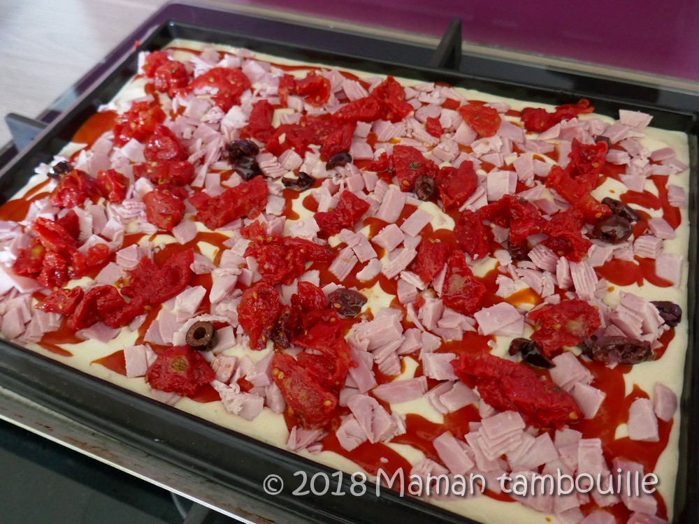 Emincer le jambon, les tomates, les olives, la mozzarella.