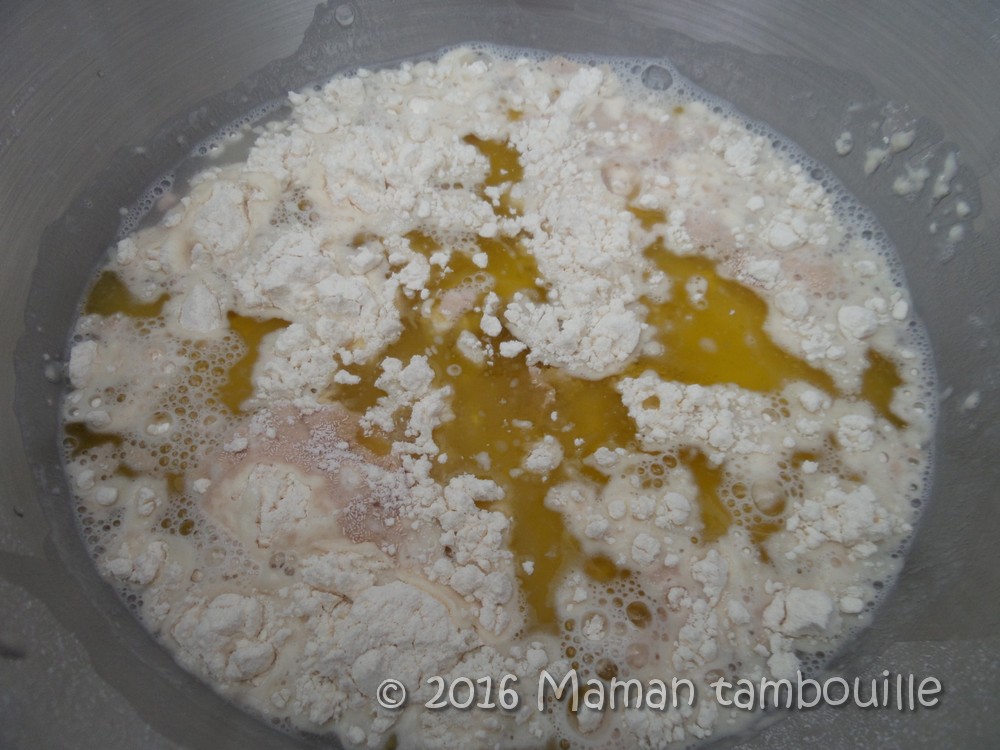 Dans un saladier (ou un robot avec le pétrin pour les plus paresseuses comme moi 😉 ), mettre la farine, la levure, l’eau et l’huile d’olive.