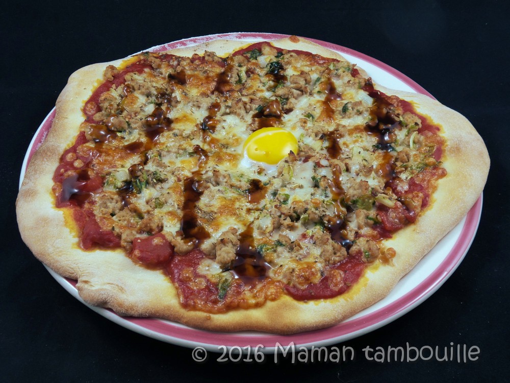 J’avais une envie irrésistible de pizzas maison depuis quelques semaines déjà. Le paquet de préparation pour pizza Francine reçu dans la dernière Degustabox, a évidemment relancé mon envie (même si, habituellement, je fais ma pâte à pizza maison). J’ai utilisé les 2 sachets de préparation (500g de farine au total), et j’en ai fait 3 grandes pizzas. Je vous livre aujourd’hui ma première version de pizza, une pizza aux tendances japonaises puisque je l’ai garni de mon reste de farce à gyoza.