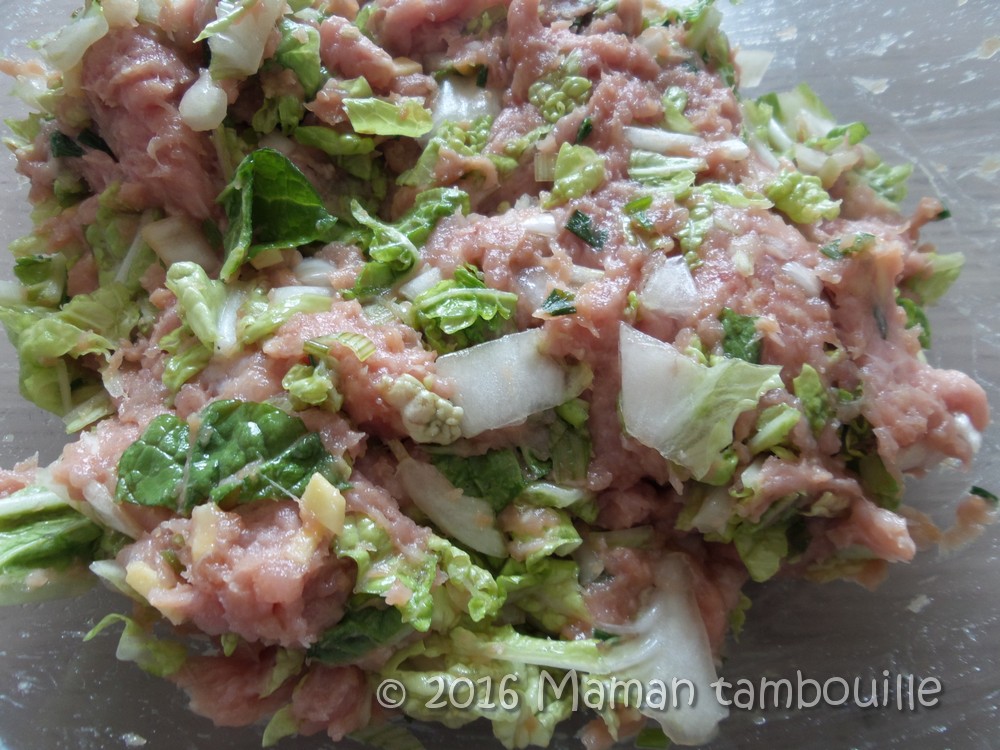 Mettre le porc dans un saladier. Ajouter la ciboulette émincée, l’oignon nouveau, le gingembre épluché et finement émincé, la gousse d’ail écrasée au presse-ail ou finement émincée.