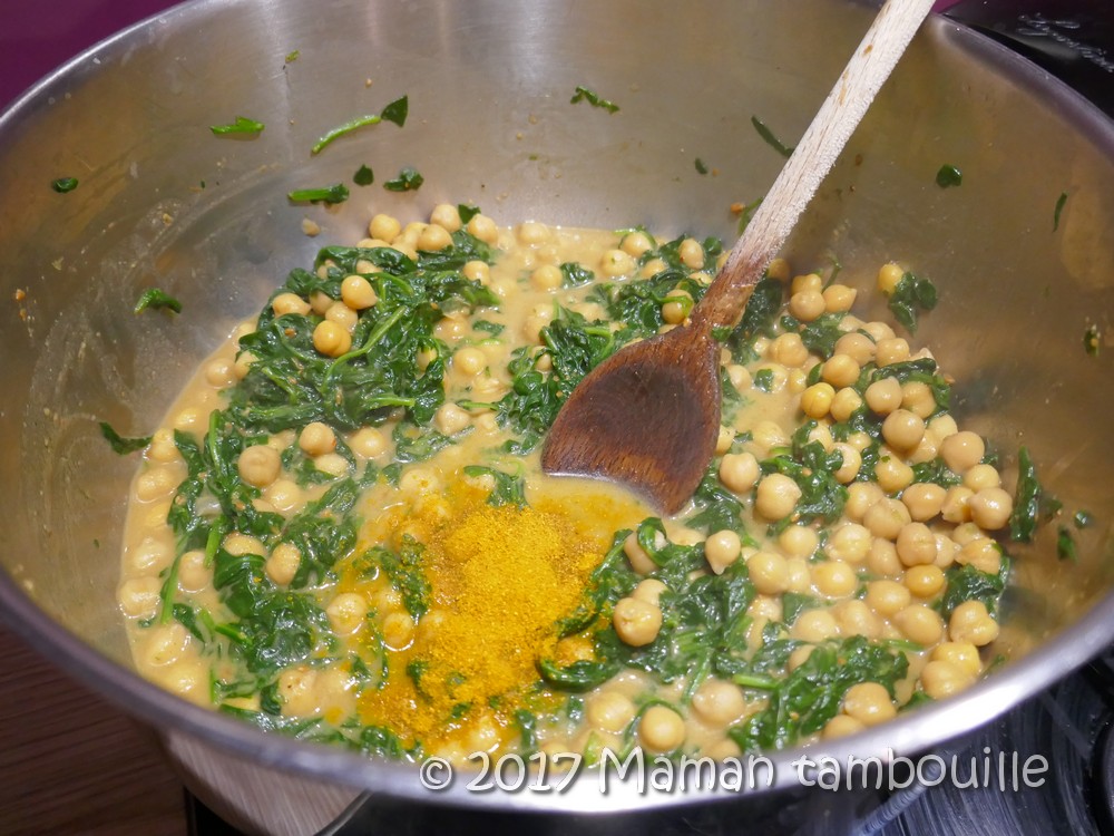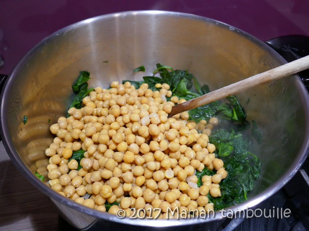 Quand les épinards sont tombés, vider le jus et ajouter les pois chiches.