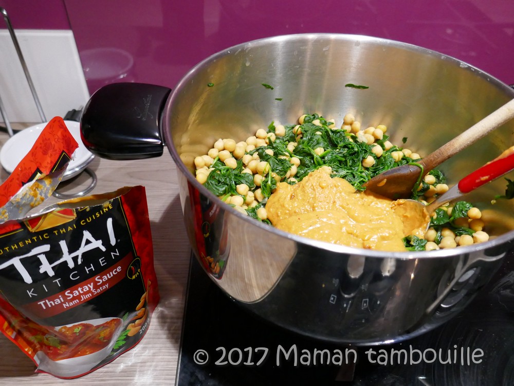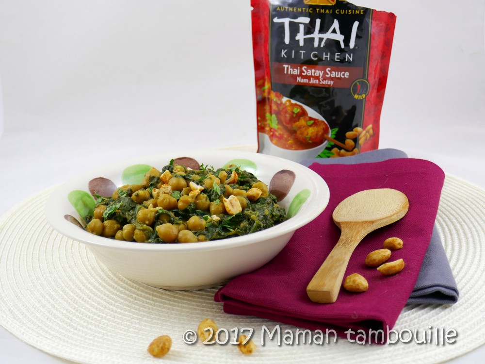 J’ai voulu tester la préparation Thai Kitchen satay sauce reçue dans la dernière Degustabox. Normalement, on l’utilise pour mariner les viandes mais je n’avais pas trop envie de viande alors je m’en suis servie pour faire une espèce de tambouille aux épinards et pois chiches.