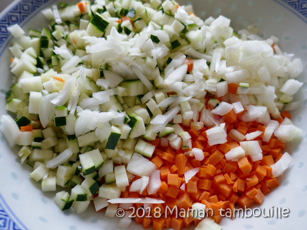 Couper les légumes en tout petits cubes (vive le coupe légumes !).