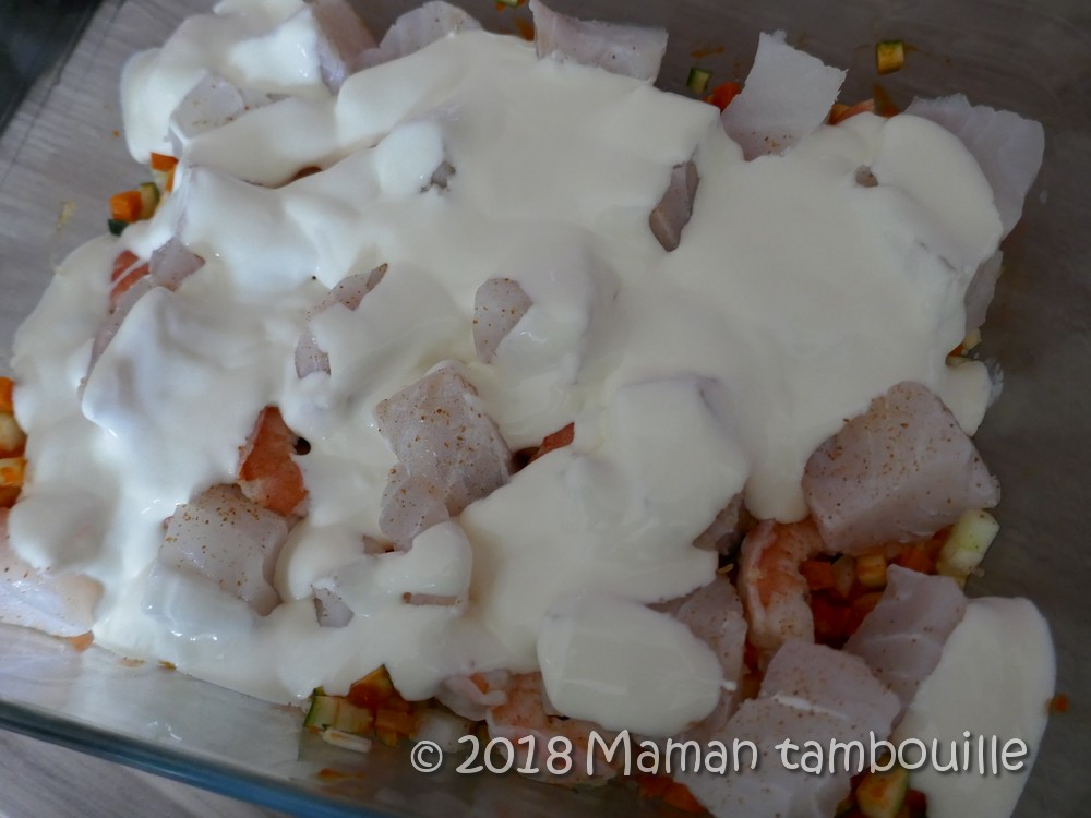 Poser sur le dessus le cabillaud coupé en cubes et les crevettes décortiquées.